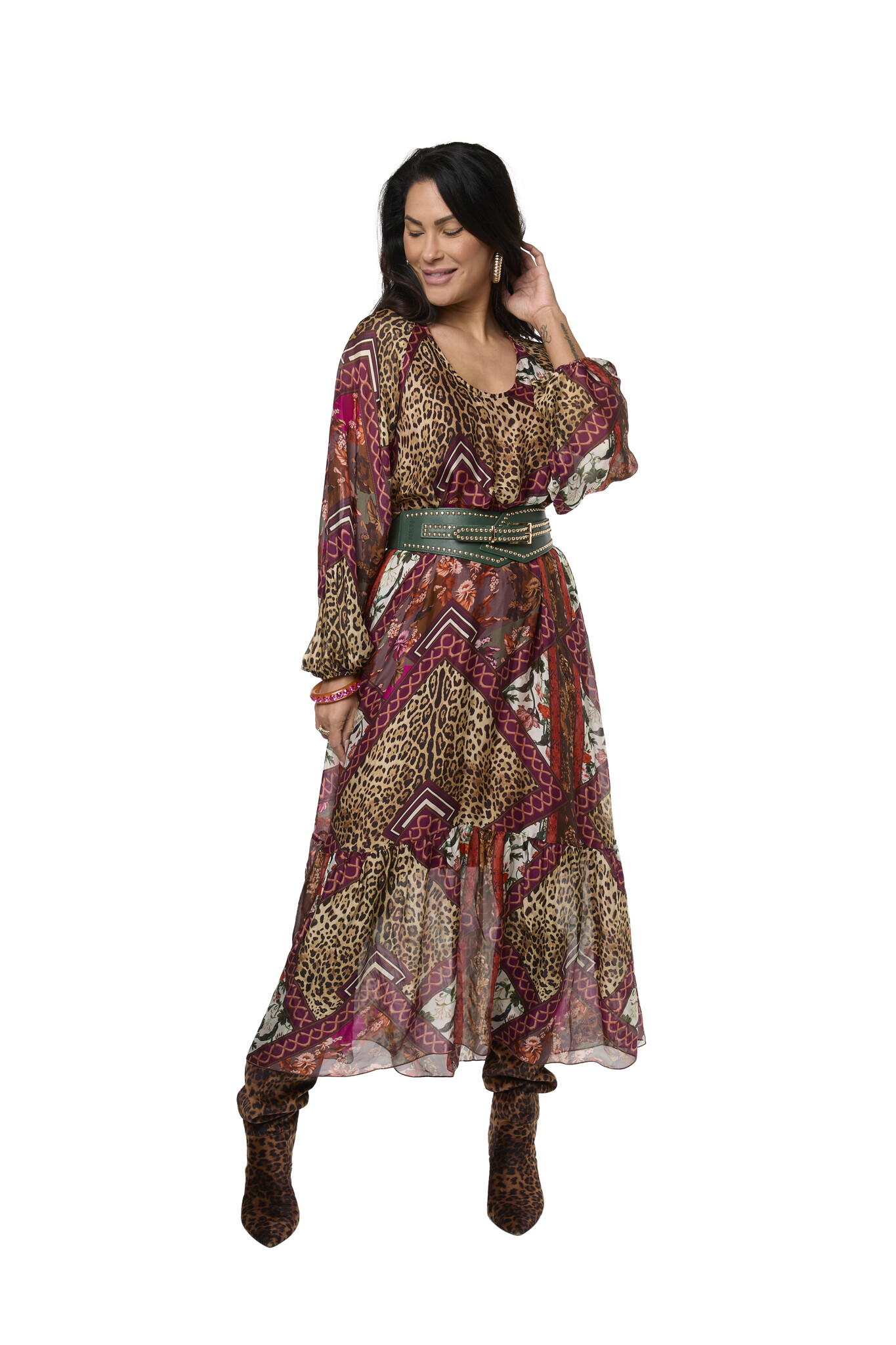 Das Suzume Palermo Kleid hat einen wunderschönen Druck und eine schöne Farbkombination. Die hohe Taille lässt die Figur schlanker wirken. Der schöne Rundhalsausschnitt sorgt für einen femininen Look.