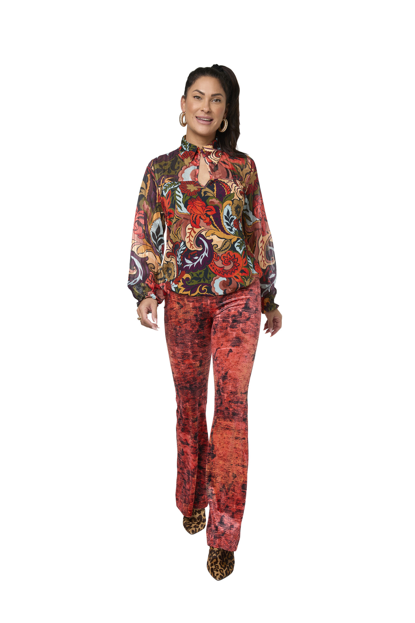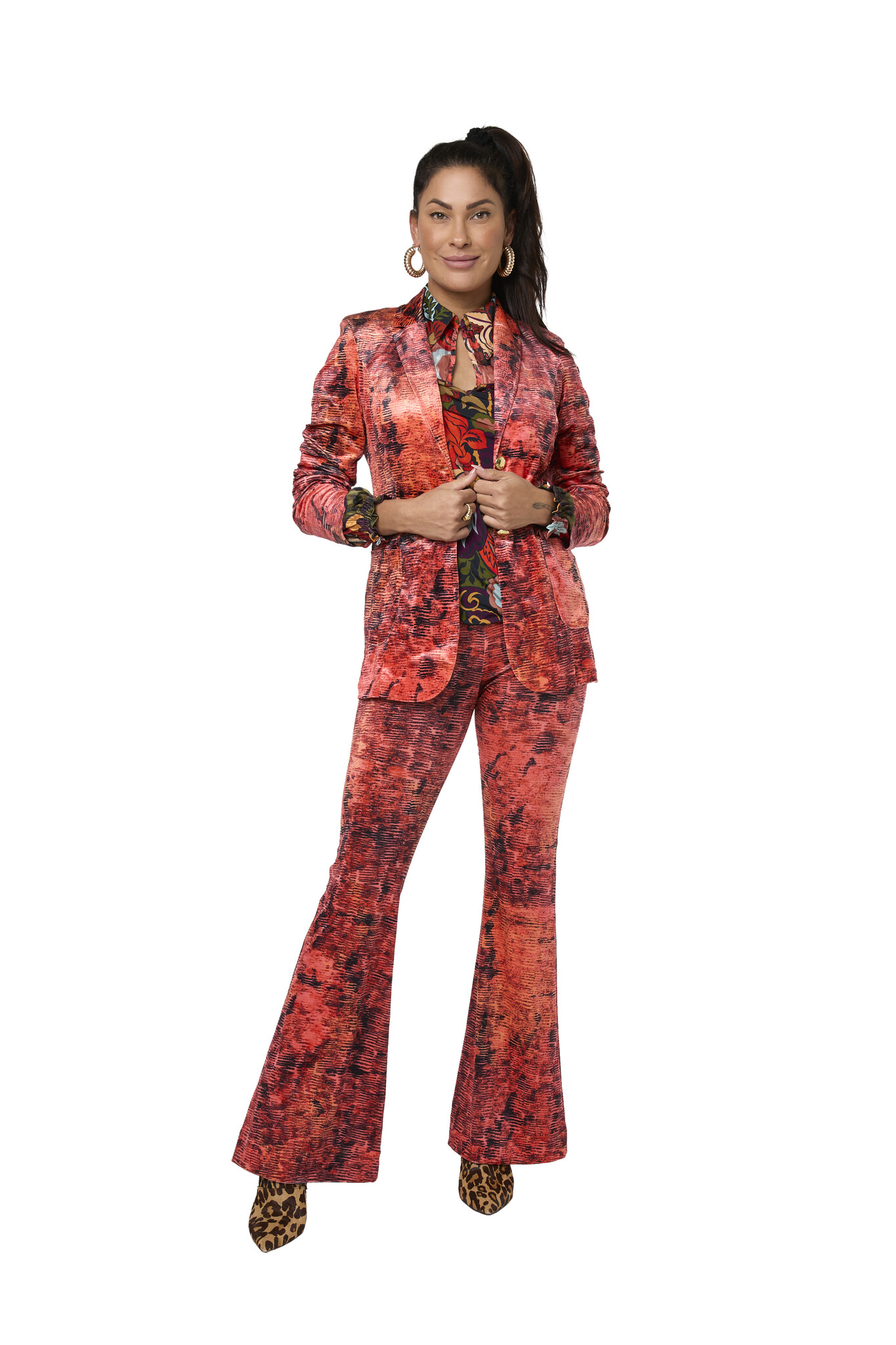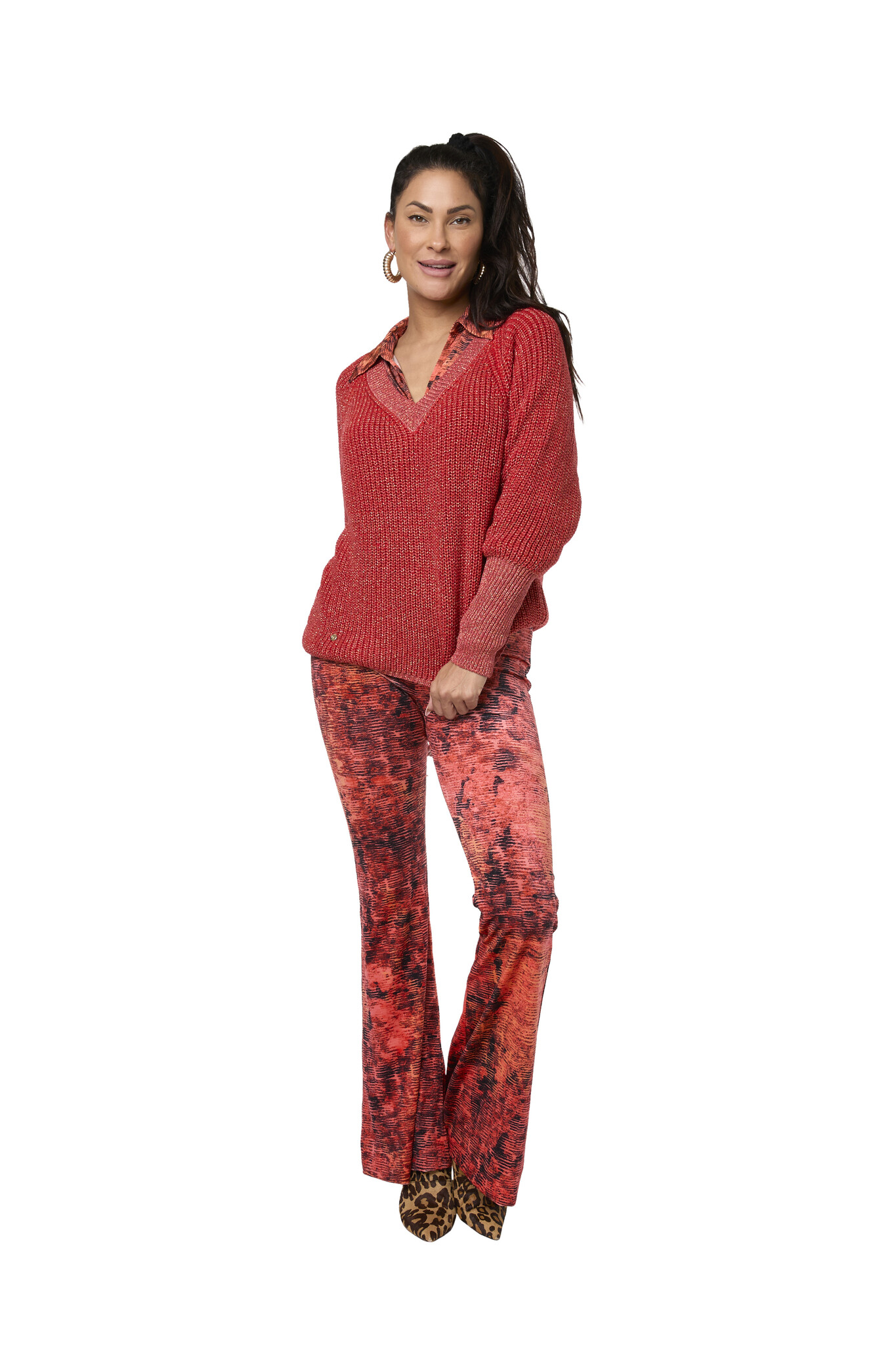 The Blare Estru Pants are beautiful soft pants with wide flared legs. The pants have a beautiful print with beautiful colors that you want to be seen with. Easy to combine with the Lucia Estru Top or the matching Edith Red Sweater.