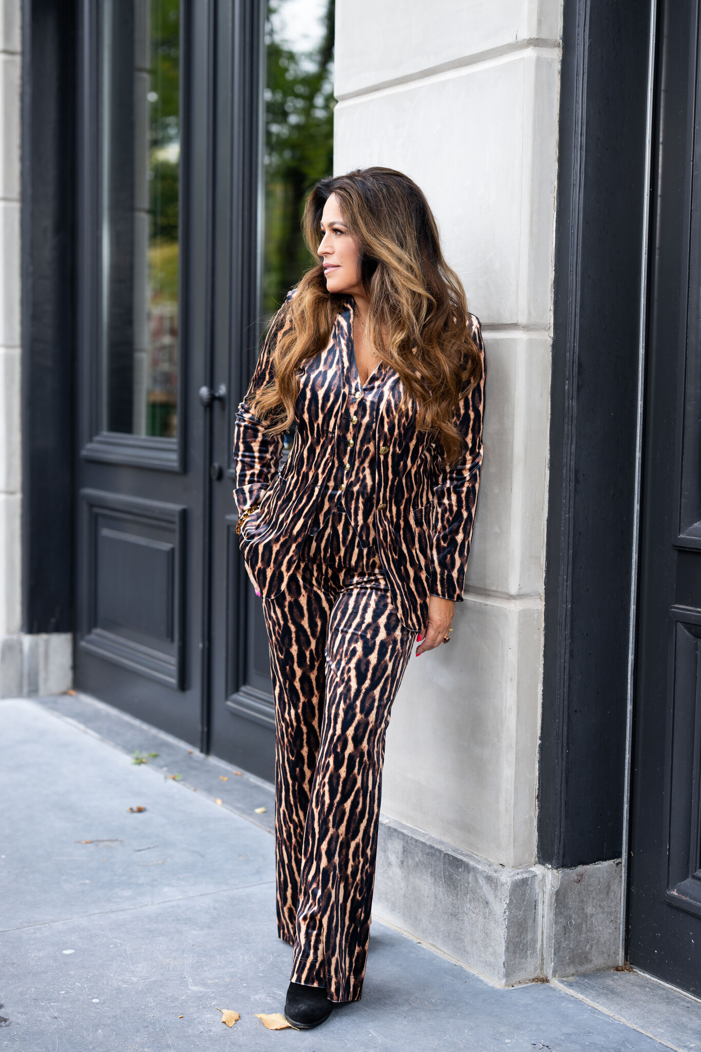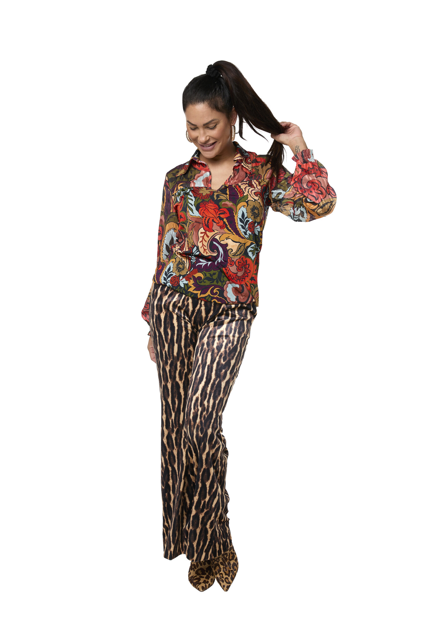 The Eileen Spisone pants are beautiful soft-touch pants with wide flared legs. The pants have a zipper on the front and a button and a drawstring at the top to close the pants properly. Can be combined with the Landa Cantania Top.
