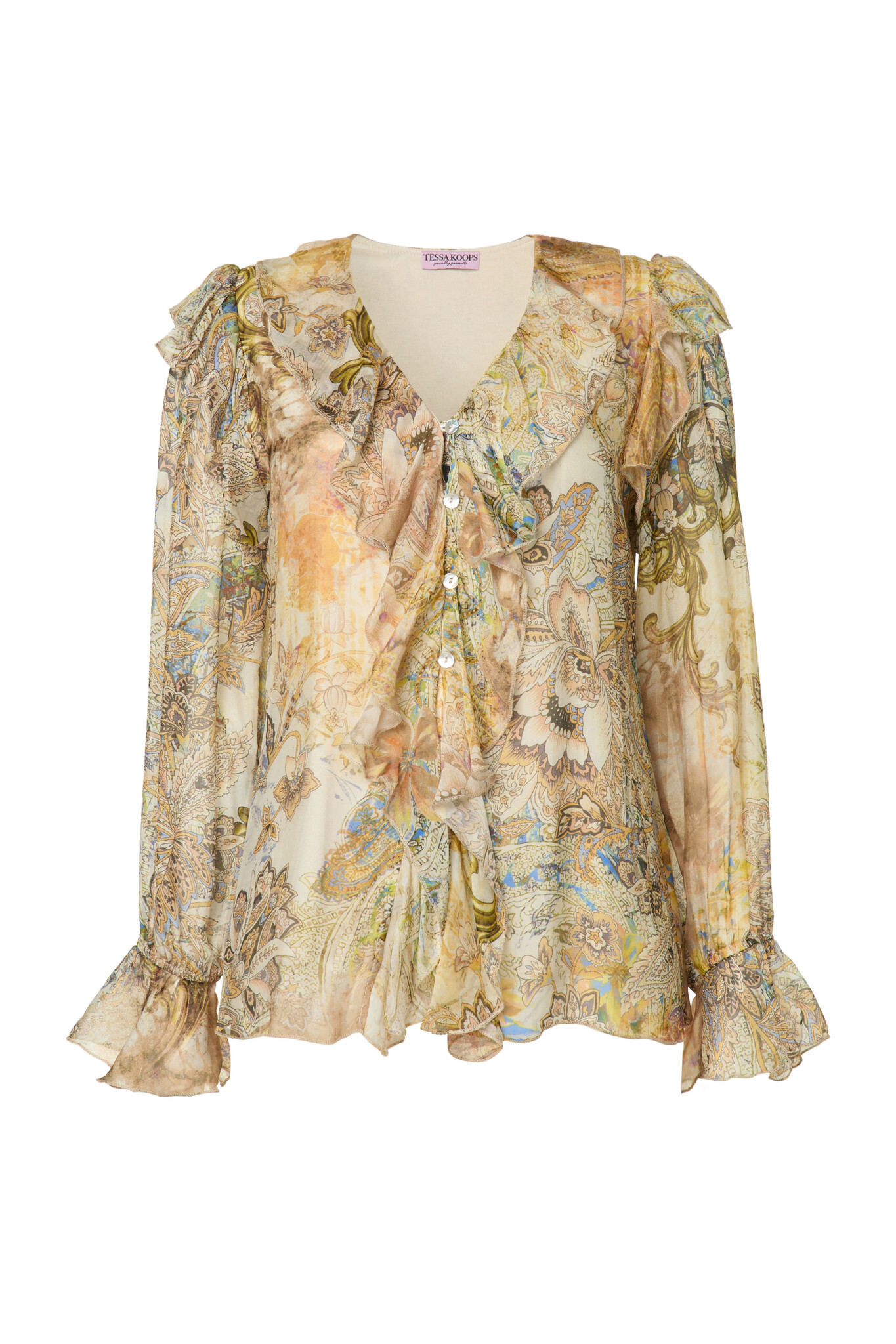 The Lorena Batutta Top features a playful V-neck with subtle ruffles along the neckline and shoulders, creating a soft and romantic look. The long sleeves end in elegant ruffles. Read more