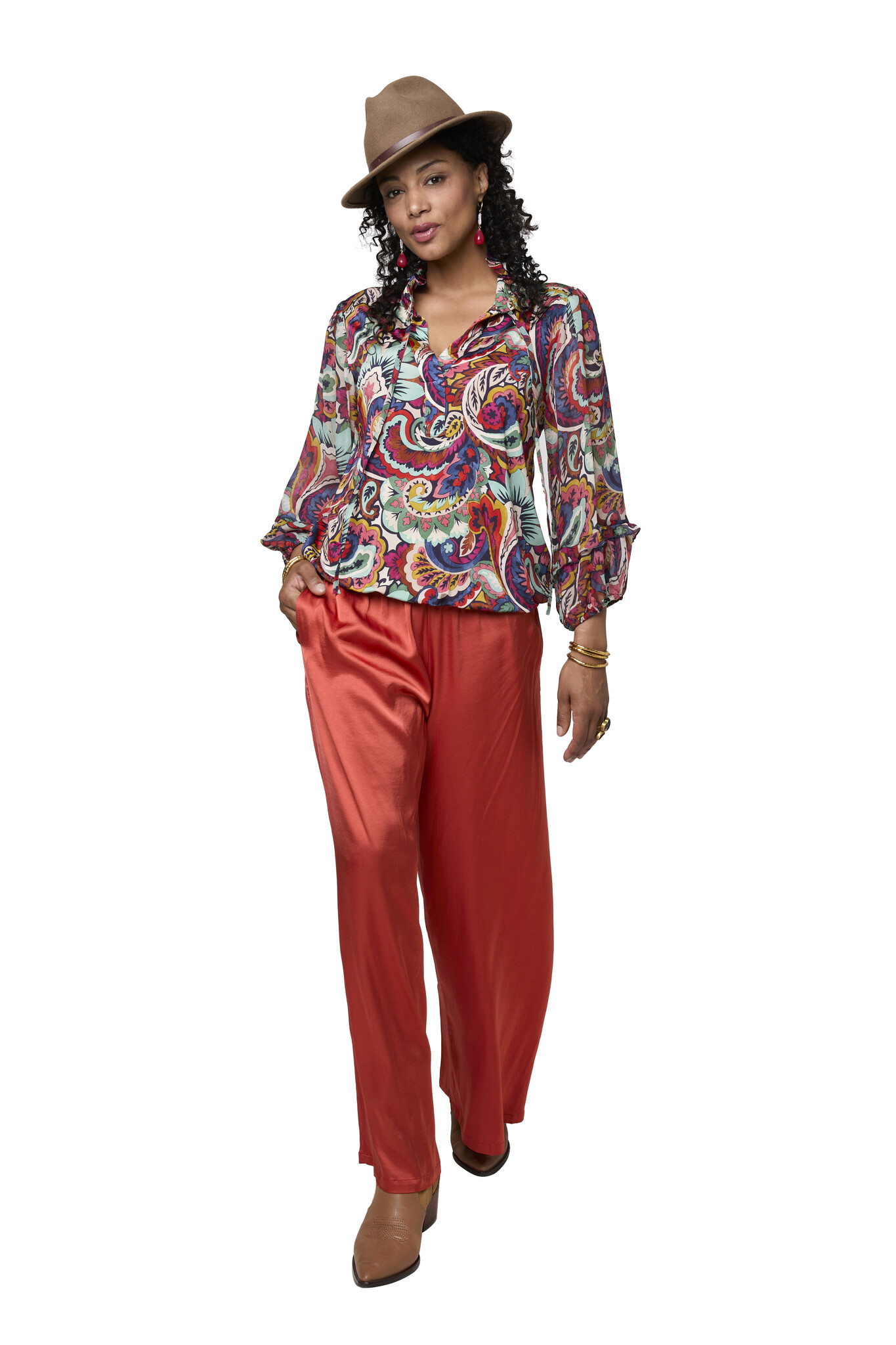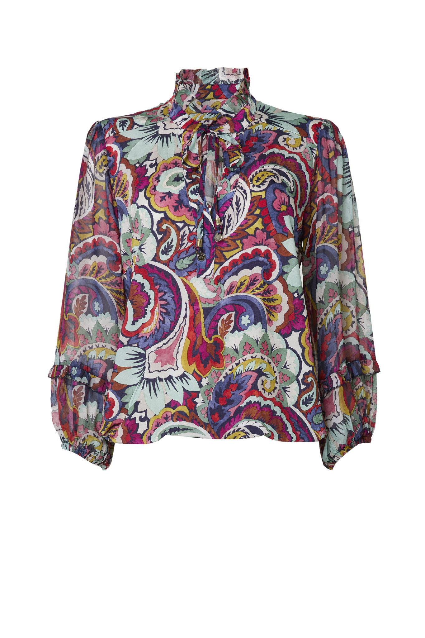 The Rita Springfield Top features a colorful paisley print.The high neck with a bow detail creates an elegant look. Wear the bow loose for a casual look or tied for a chic look.The sleeves are finished with ruffles and elastic cuffs, creating a beautiful puff. This gives the top that extra fashionable touch without compromising its wearability.