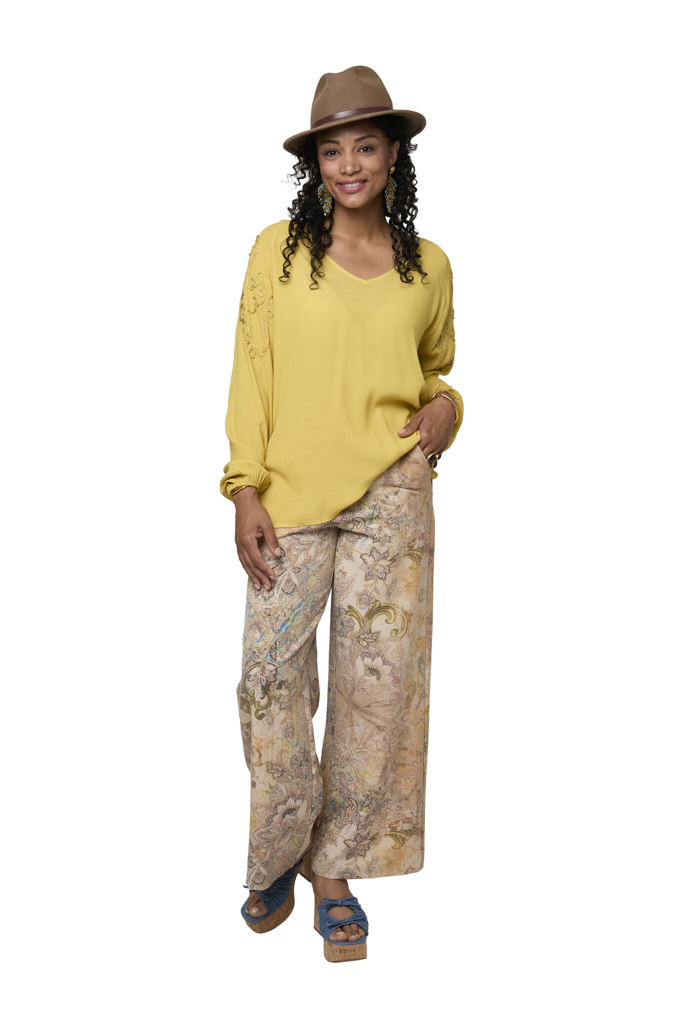 De Amira Yellow Top heeft een prachtige V-hals en lange mouwen. Op de mouwen is een prachtig borduursel aangebracht dat de top onderscheidt van andere tops. Deze top is te combineren met een spijkerbroek of de bijbehorende Patrizia Yellow Broek voor een chique jumpsuit look.