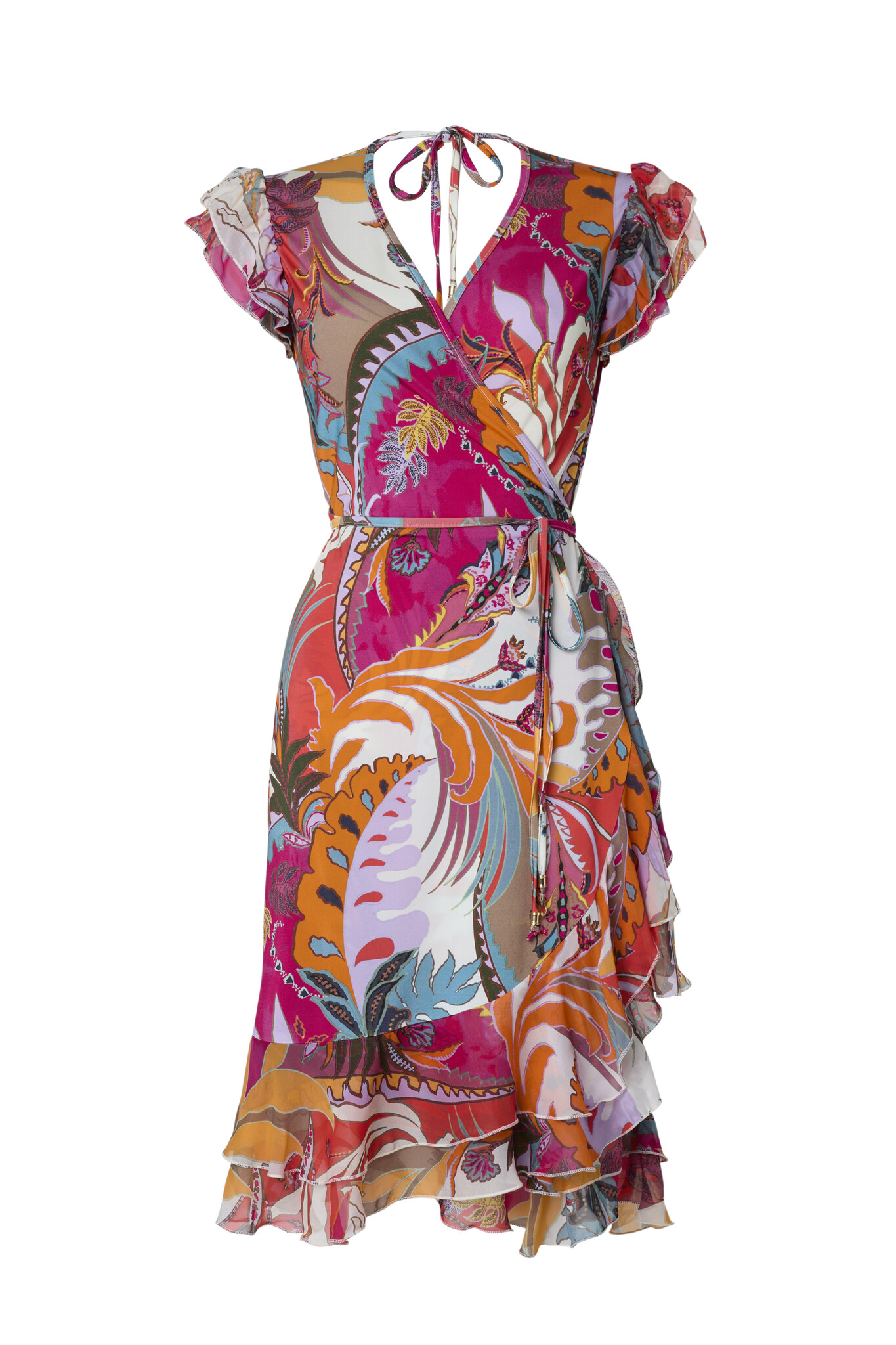 De Cindy Vespucci Jurk is een korte wikkeljurk met een V-hals zonder mouwen. Je taille wordt geaccentueerd door het omslageffect. Door het koordje heeft deze wikkeljurk een makkelijke pasvorm. De ruche aan de onderkant is van chiffon en geeft een speels effect aan de jurk.