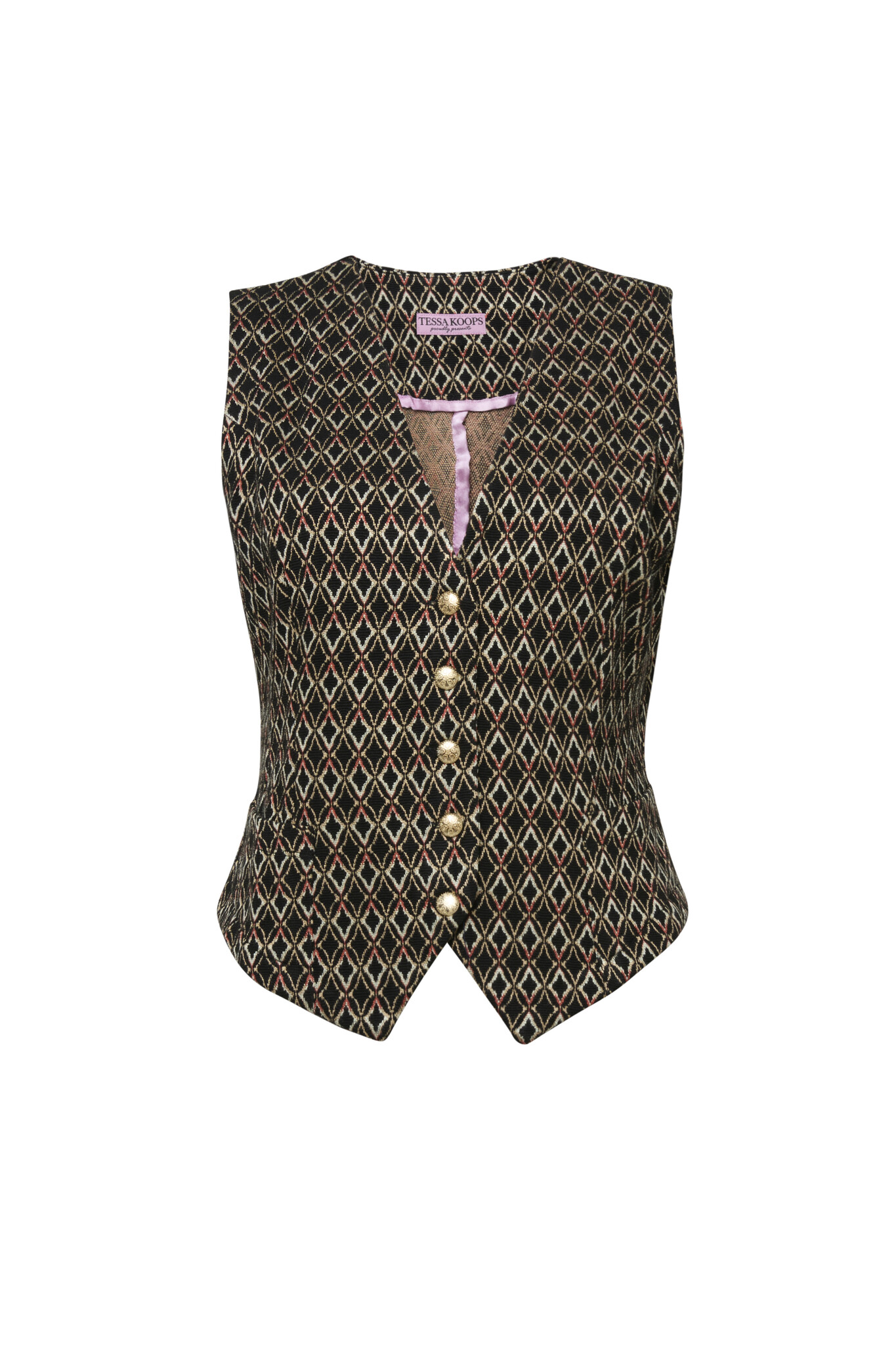 De Denise Calpe Gilet heeft een prachtige print en kleuren combinatie. De gilet heeft 5 zwart knopen aan de voorkant om de gilet dicht te maken en 2 kleine steekzakken aan de onderzijde van de voorkant.