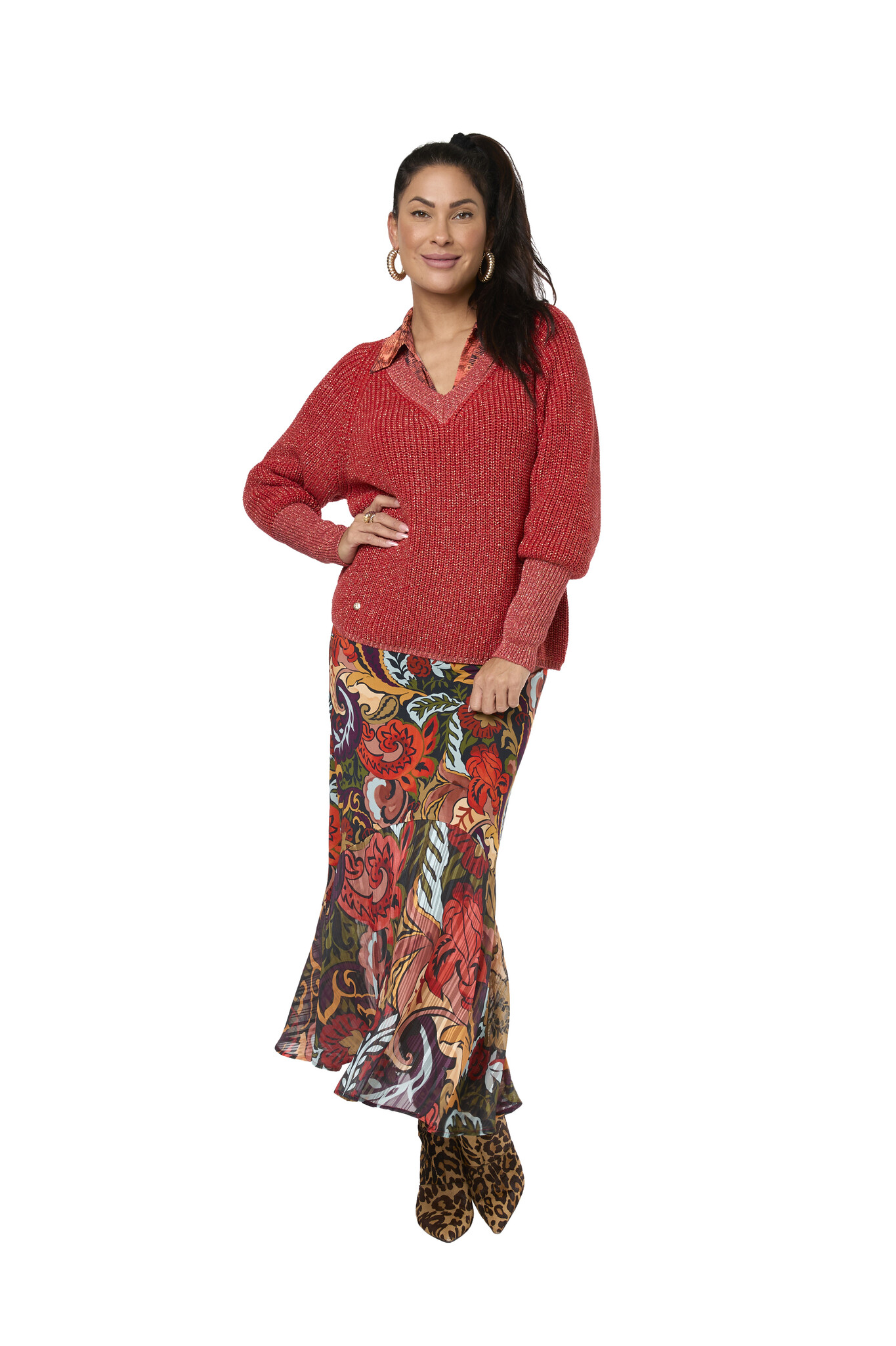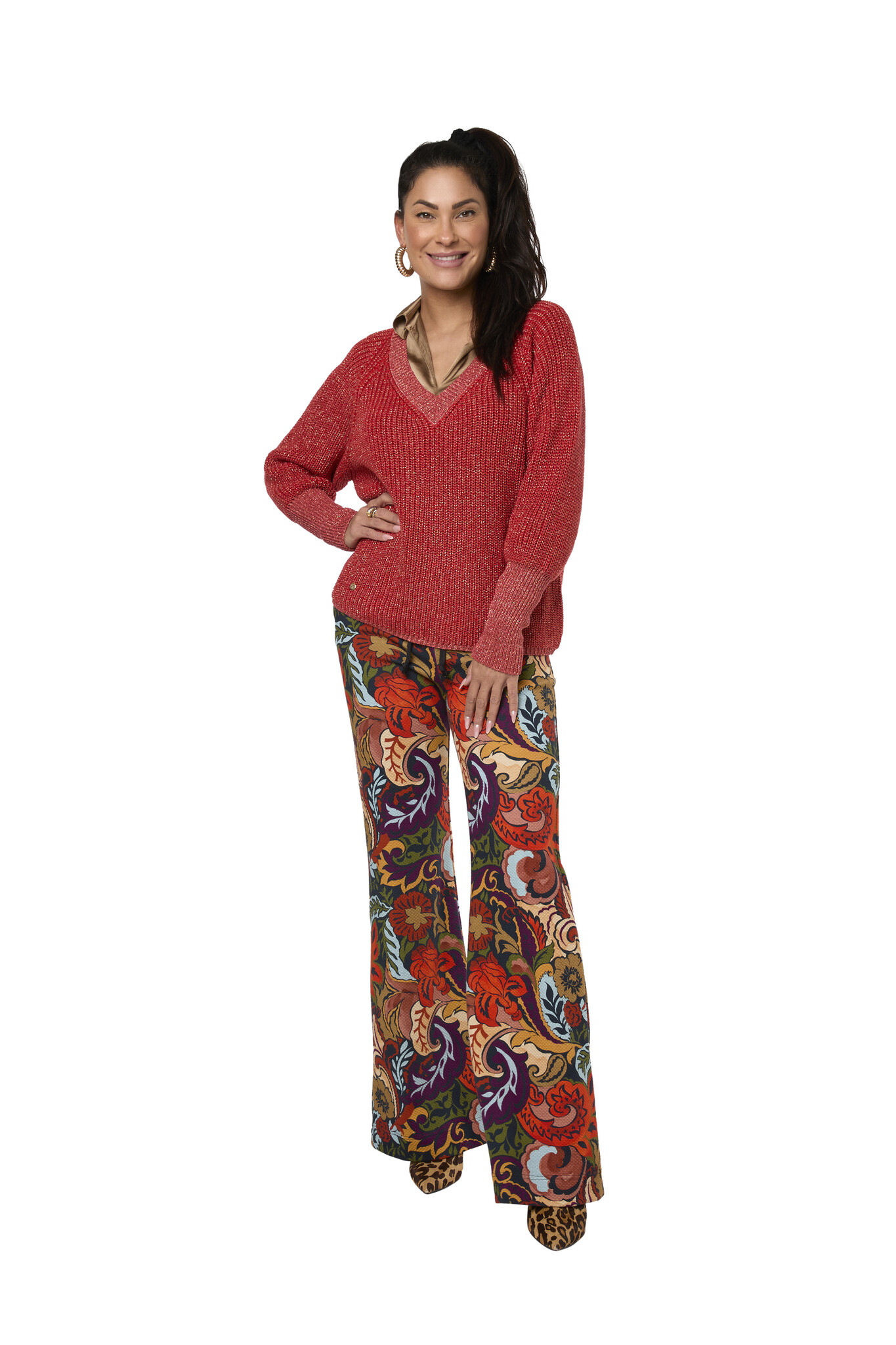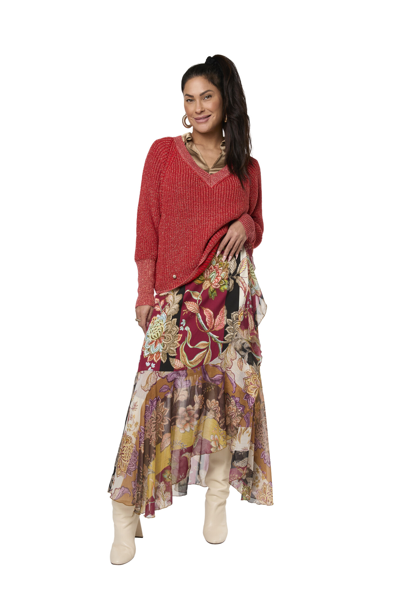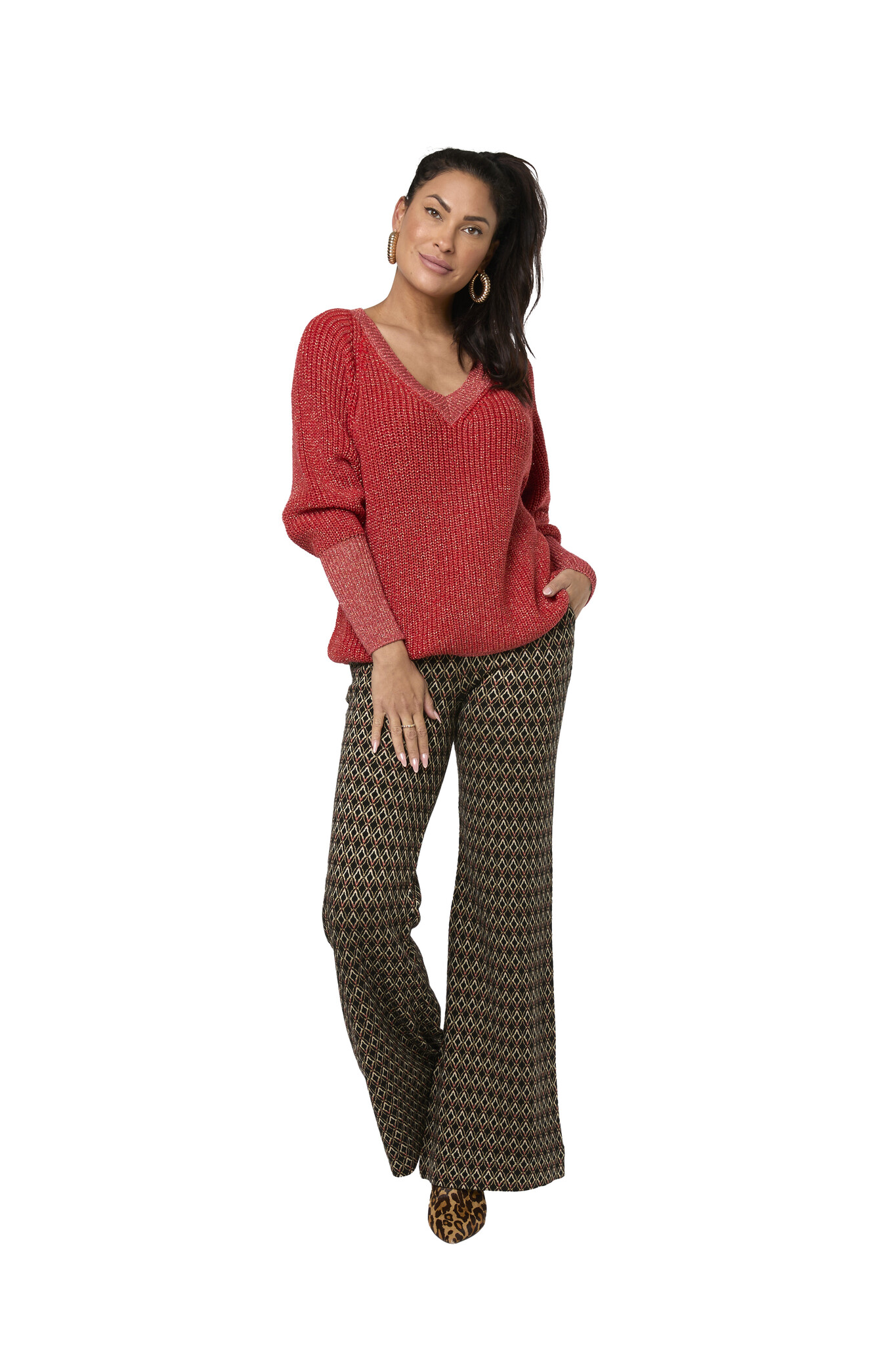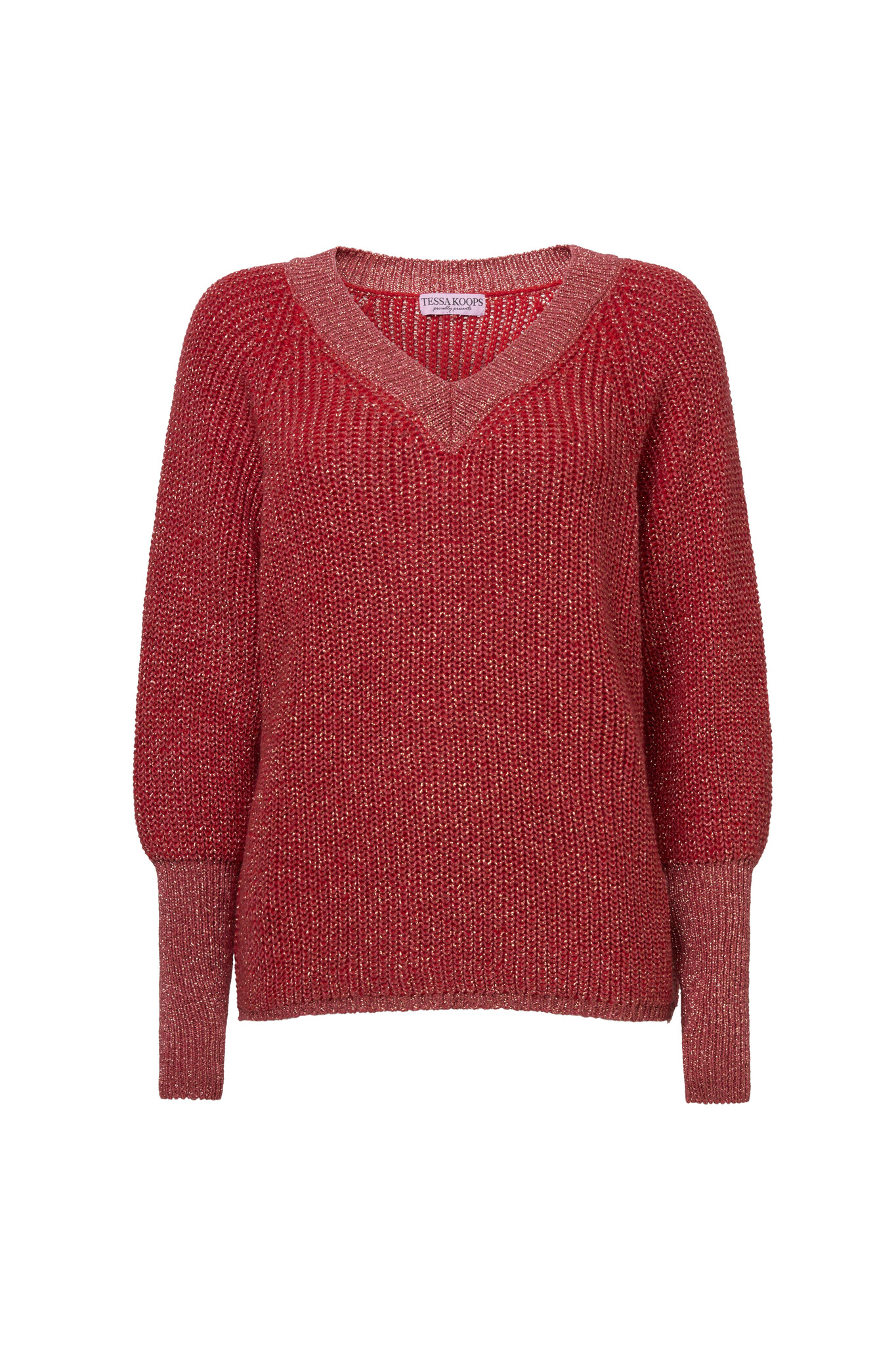 De prachtige gebreide trui heeft een V-hals, gemaakt van een mooi fantasy boucle garen met een rode glitter. De trui combineert makkelijk met diverse prints.