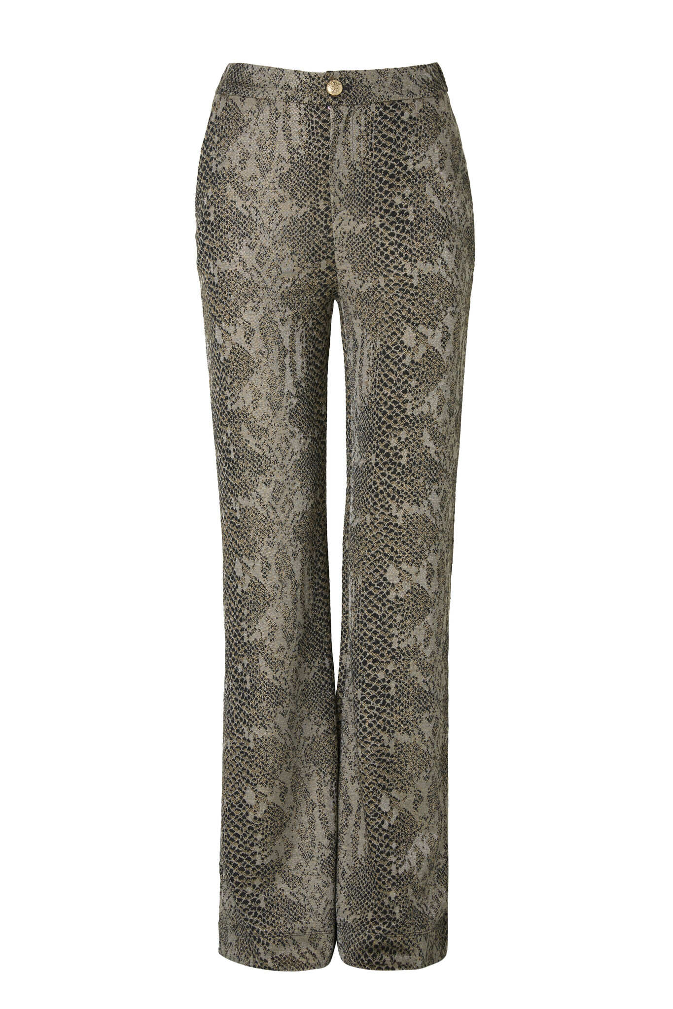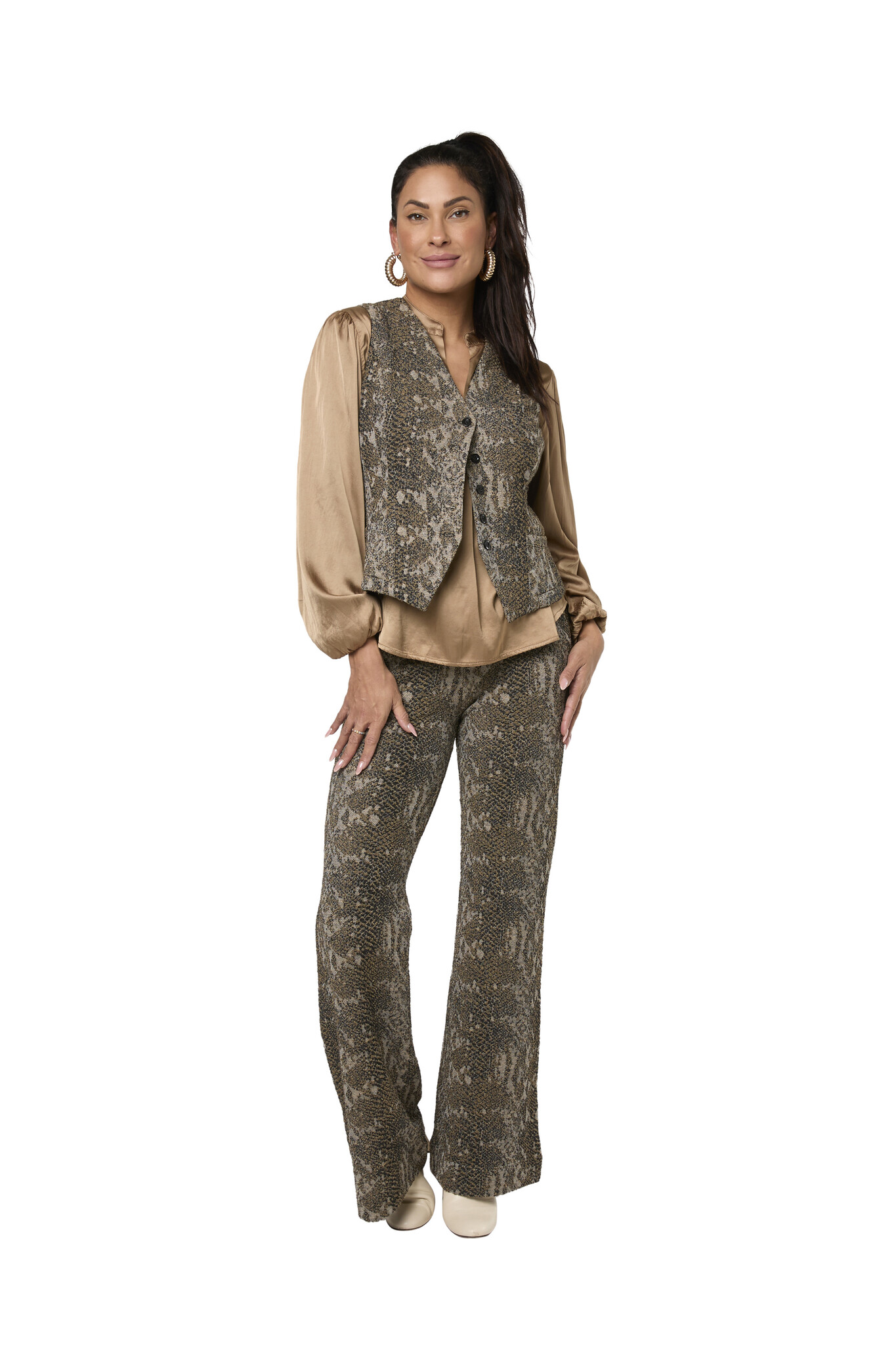De Eileen Ular broek is een mooie zacht aanvoelende broek met wijd uitlopende pijpen. De broek heeft een rits aan de voorzijde en een knoop en een sluit koord aan de bovenzijde om de broek goed te kunnen sluiten. Te combineren met de Jade Satin Gold Top.