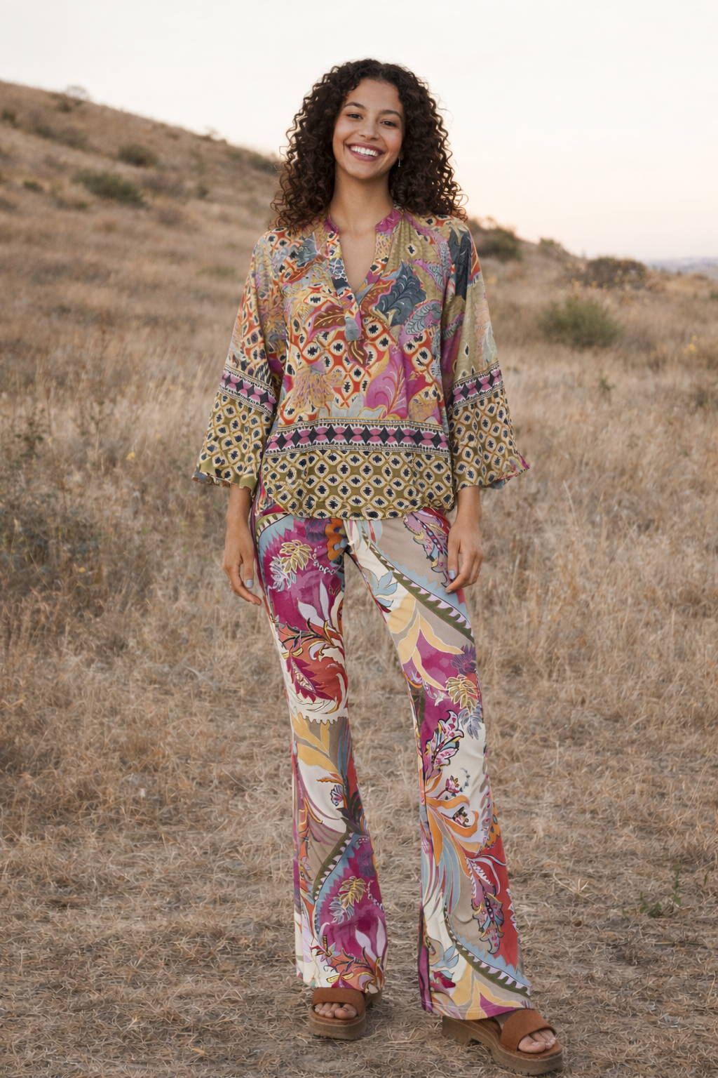De Flare Vespucci Broek is een mooie broek met flare pijpen. De broek heeft een mooie paisley print met frisse zomerse kleuren. Makkelijk te combineren met een effen top of de bijpassende Pauloes Vespucci Top. Lees meer