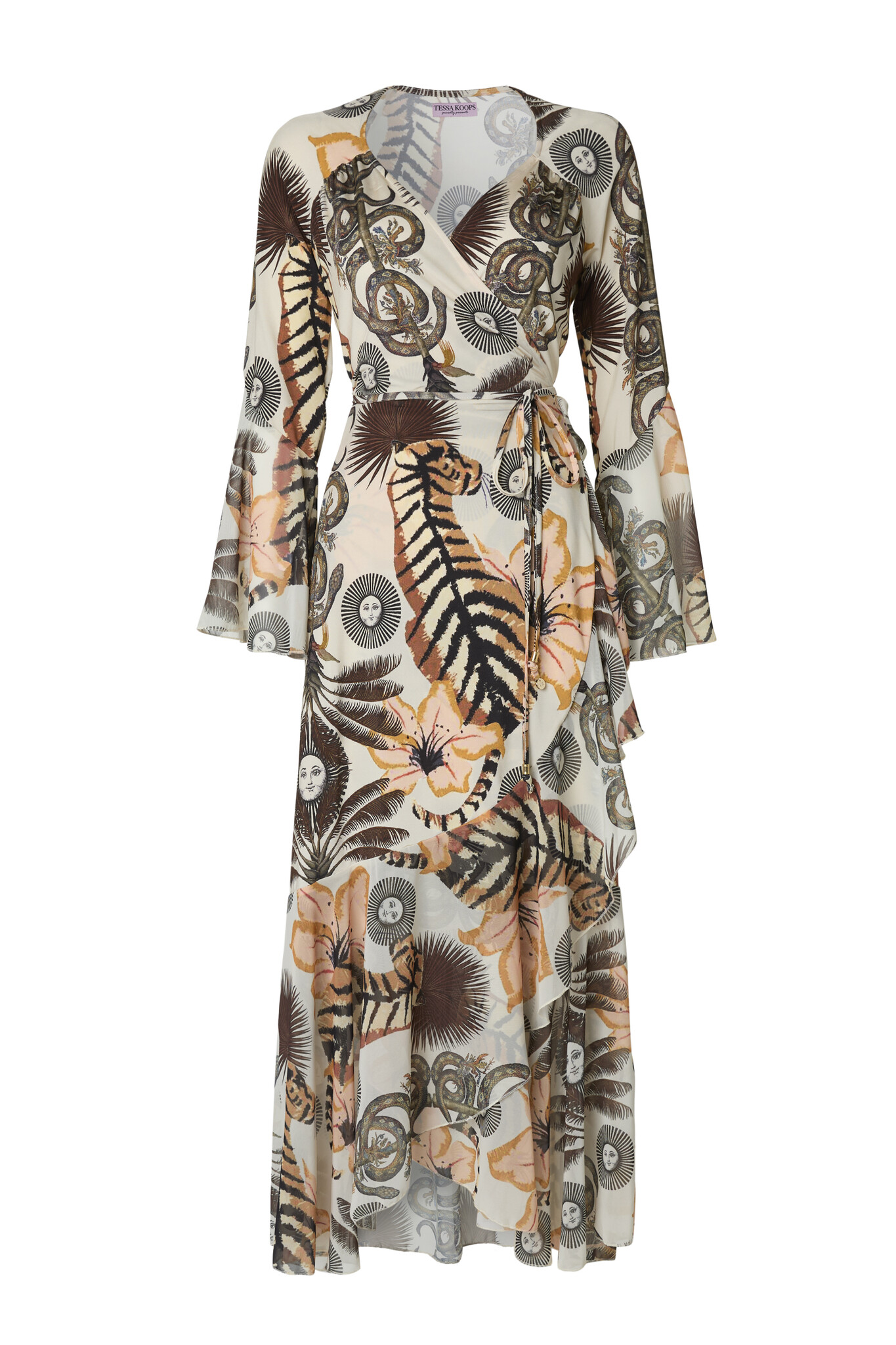 De Ilona Sun Snake Jurk is een prachtige lange wikkeljurk met een diepe V-hals. Taille wordt geaccentueerd door het omslageffect. Door middel van een koordje kun je bepalen hoe strak de jurk valt. De wijd uitlopende mouwen en de onderkant van de jurk hebben aan de uiteinde ruches.