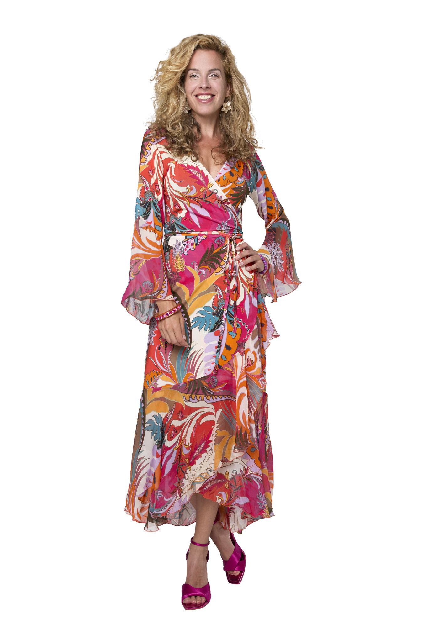 De Ilona Vespucci Jurk is een prachtige lange wikkeljurk met een diepe V-hals. Taille wordt geaccentueerd door het omslageffect. De wijd uitlopende mouwen en de onderkant van de jurk hebben aan de uiteinde ruches. Lees meer