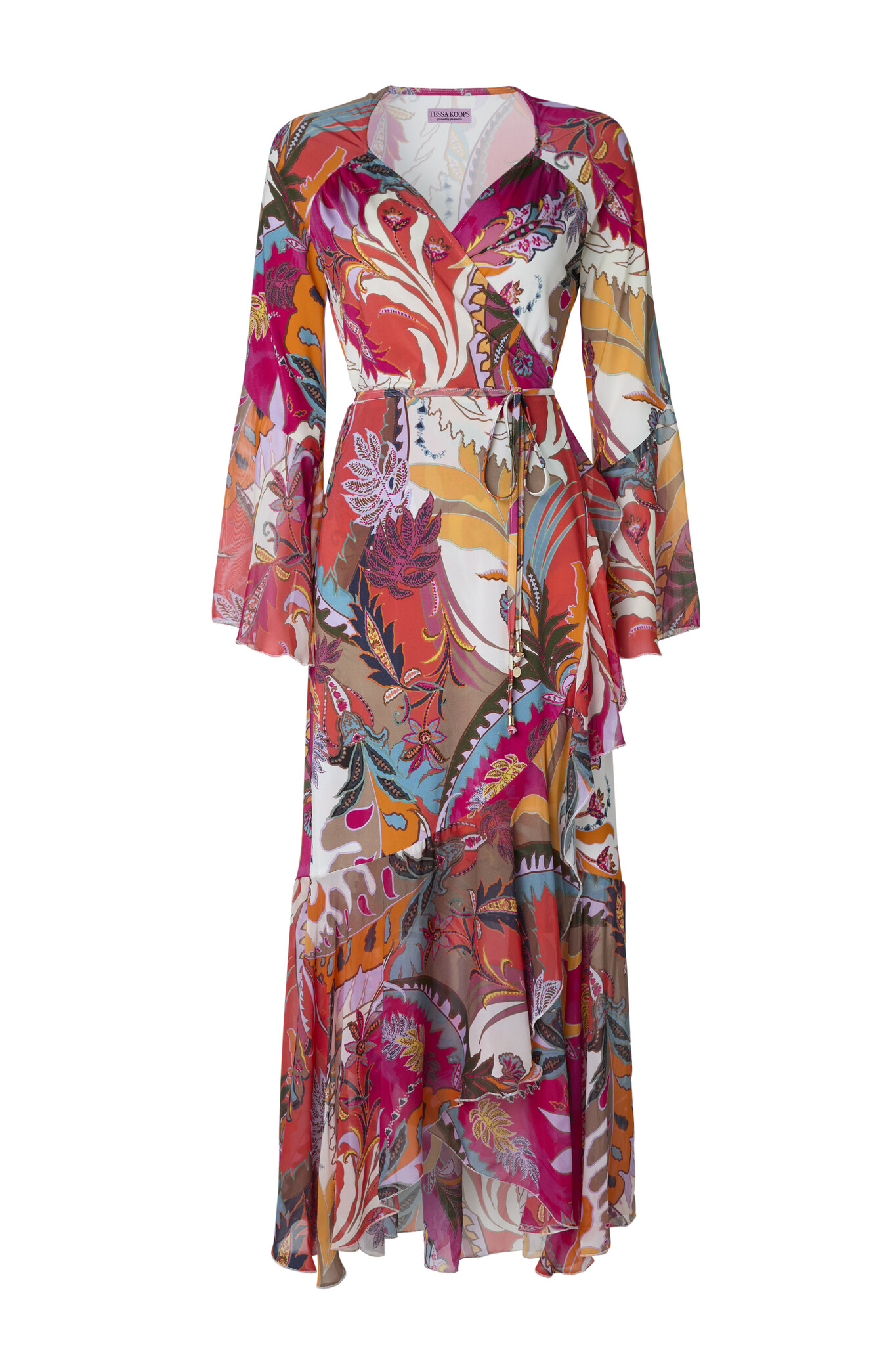 De Ilona Vespucci Jurk is een prachtige lange wikkeljurk met een diepe V-hals. Taille wordt geaccentueerd door het omslageffect. Door middel van een koordje kun je bepalen hoe strak de jurk valt. De wijd uitlopende mouwen en de onderkant van de jurk hebben aan de uiteinde ruches.