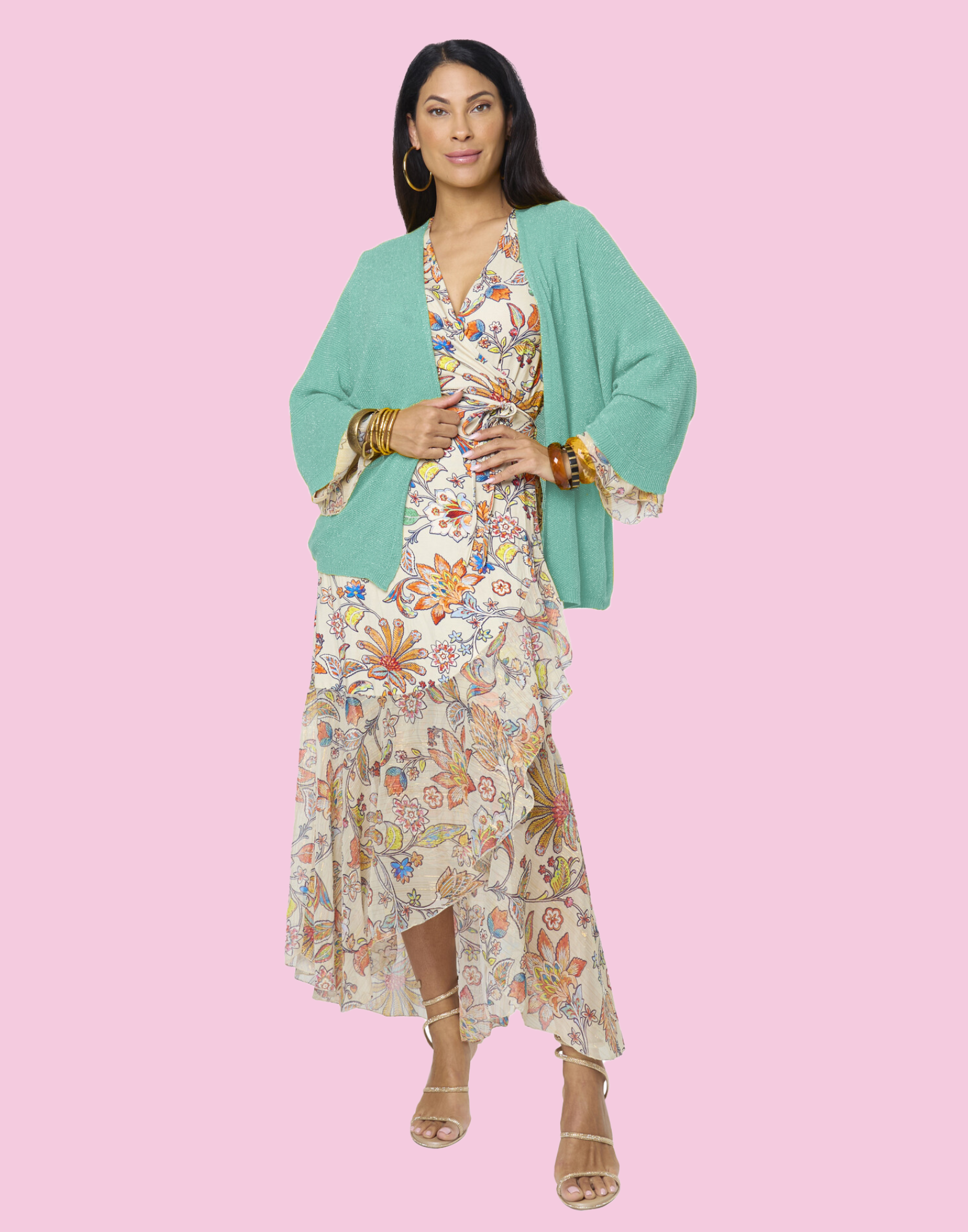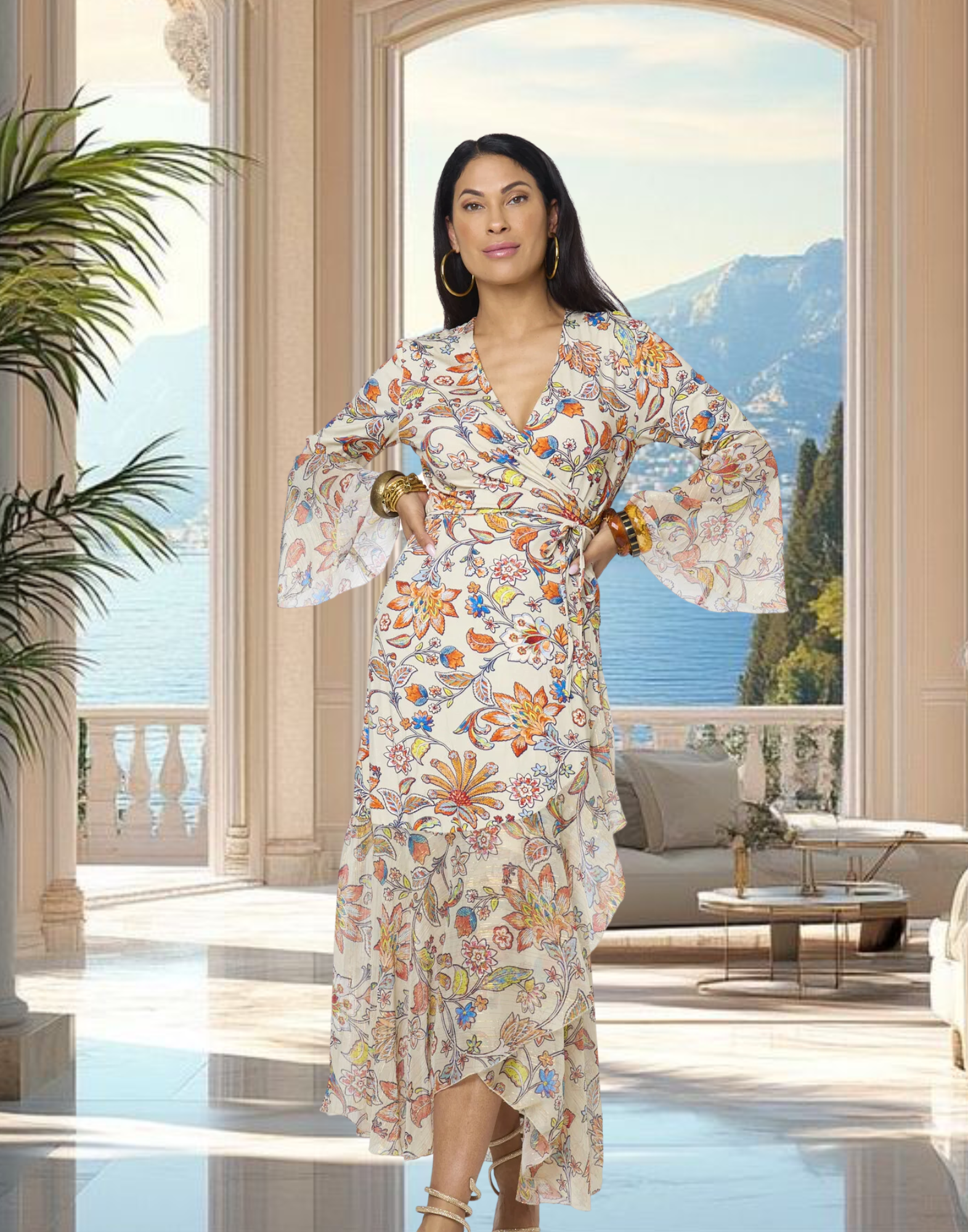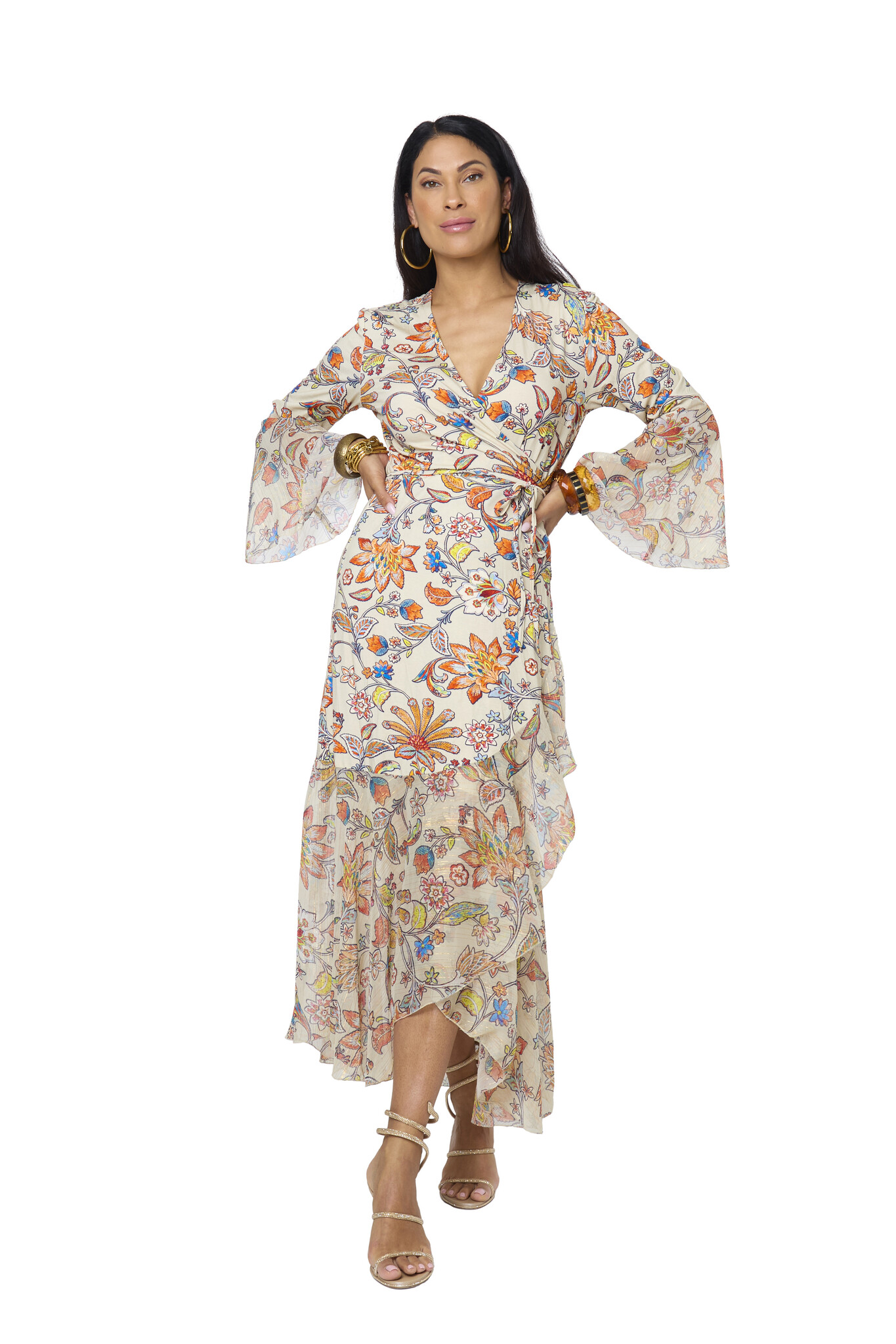 De Indira Merida Jurk is een prachtige lange wikkeljurk met een diepe V-hals. Taille wordt geaccentueerd door het omslageffect. De wijd uitlopende mouwen en de onderkant van de jurk hebben aan de uiteinde ruches. Lees meer