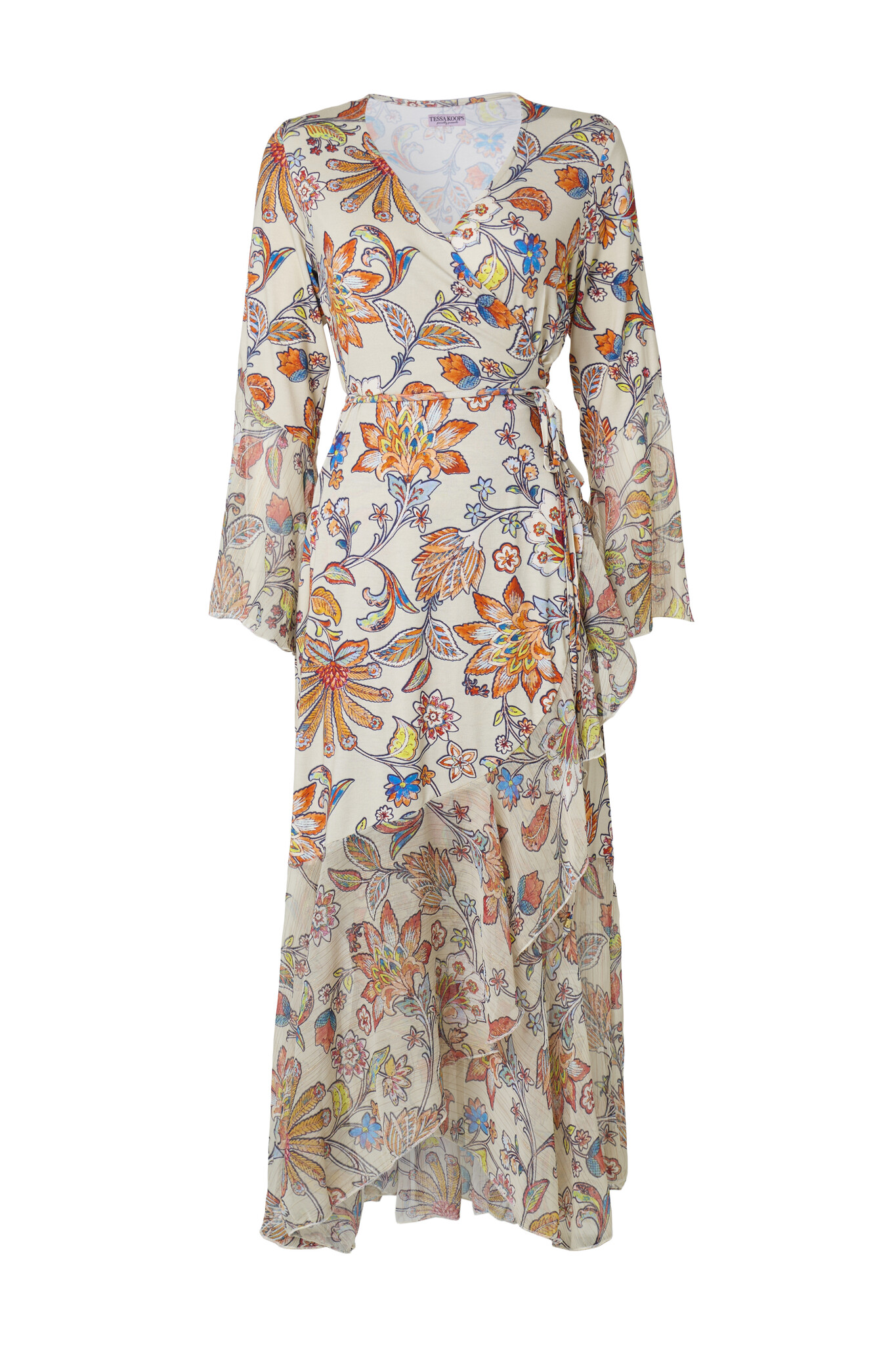 De Indira Merida Jurk is een prachtige lange wikkeljurk met een diepe V-hals. Taille wordt geaccentueerd door het omslageffect. Door middel van een koordje kun je bepalen hoe strak de jurk valt. De wijd uitlopende mouwen en de onderkant van de jurk hebben aan de uiteinde ruches.