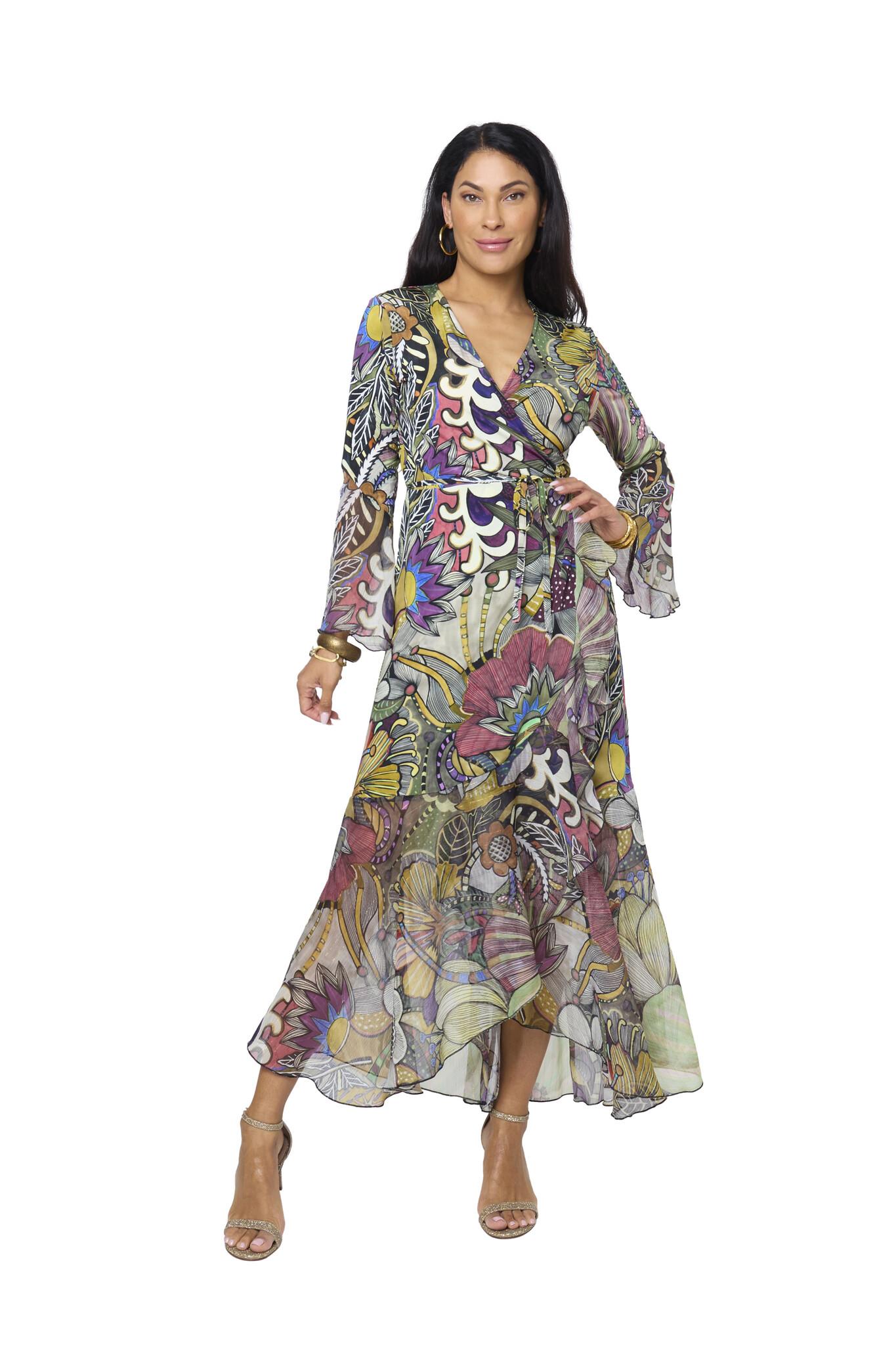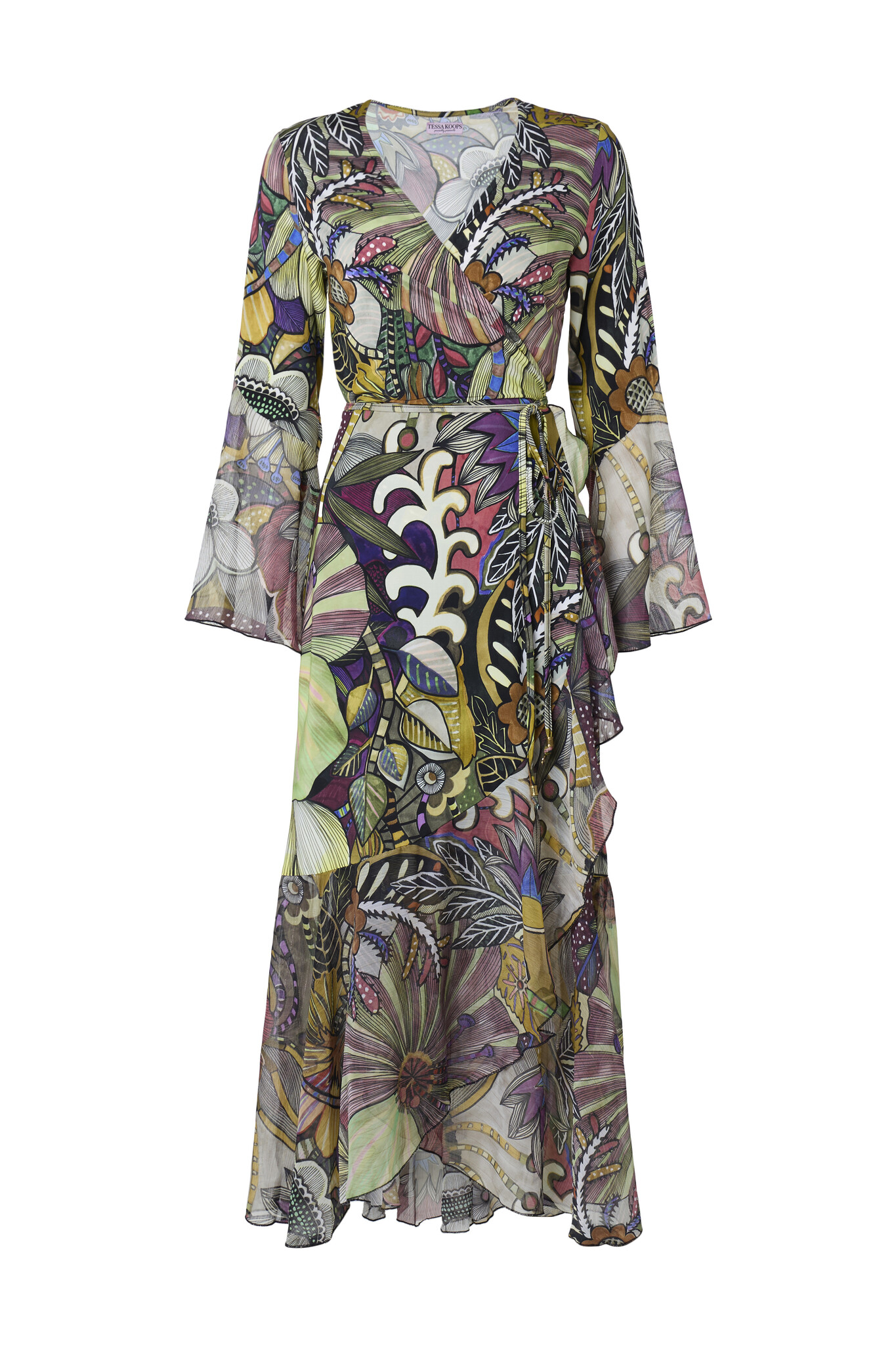 De Indira Pomo Jurk is een prachtige lange wikkeljurk met een diepe V-hals. Taille wordt geaccentueerd door het omslageffect. Door middel van een koordje kun je bepalen hoe strak de jurk valt. De wijd uitlopende mouwen en de onderkant van de jurk hebben aan de uiteinde ruches.
