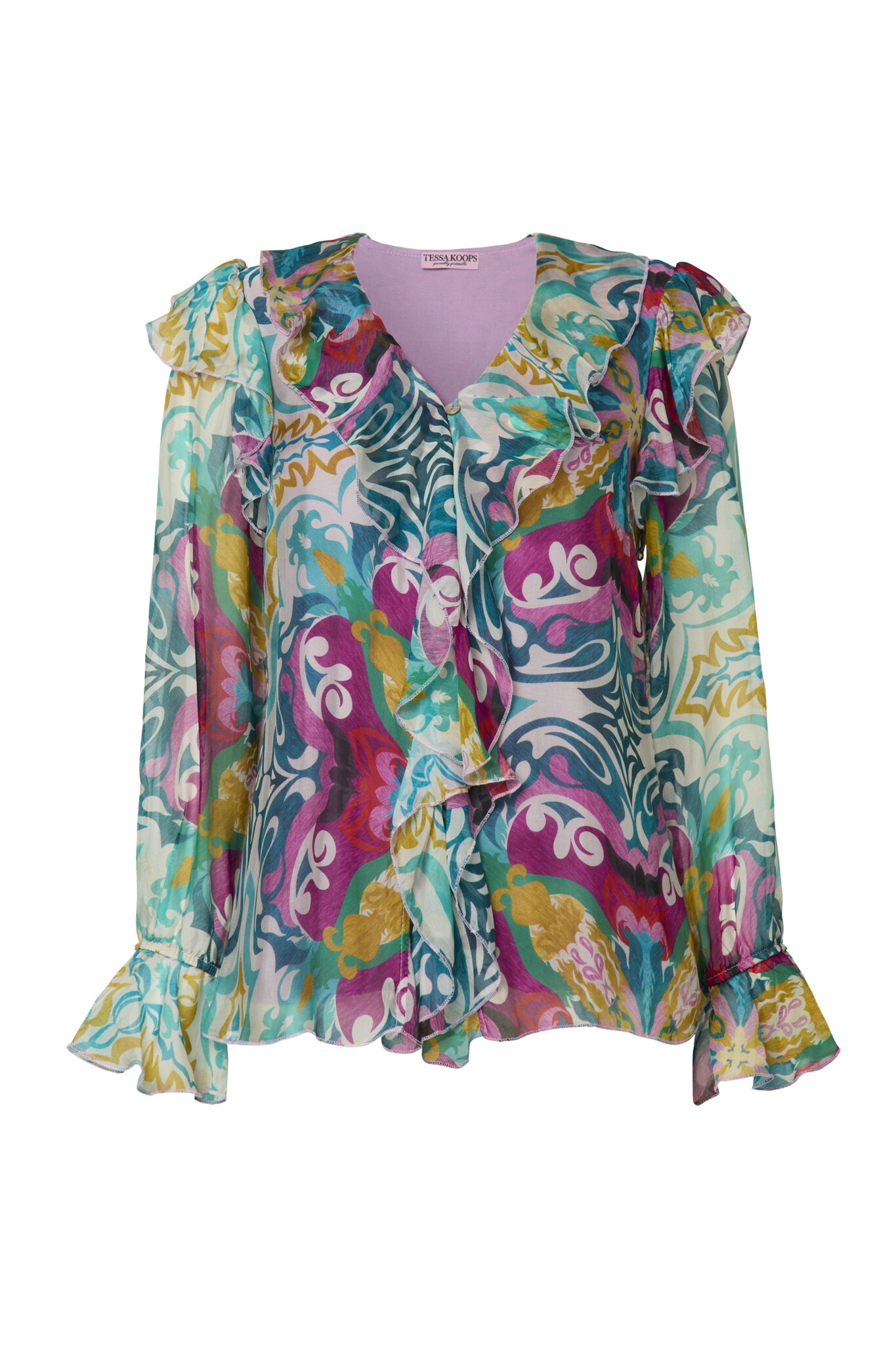 De Lorena Vasco Top heeft een speelse V-hals met subtiele ruches langs de halslijn en schouders, wat zorgt voor een zachte en romantische look. De lange mouwen eindigen in elegante manchetten met ruches. Lees meer