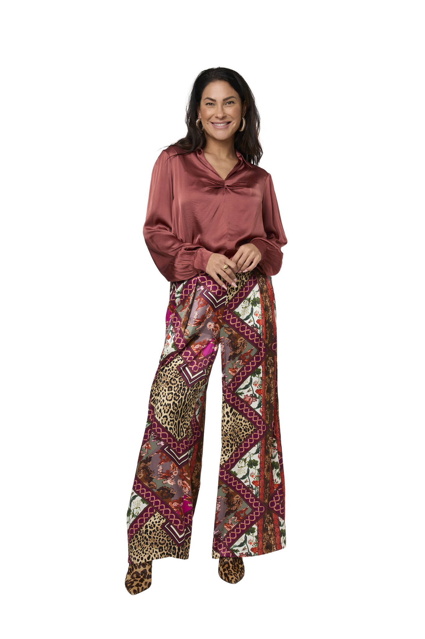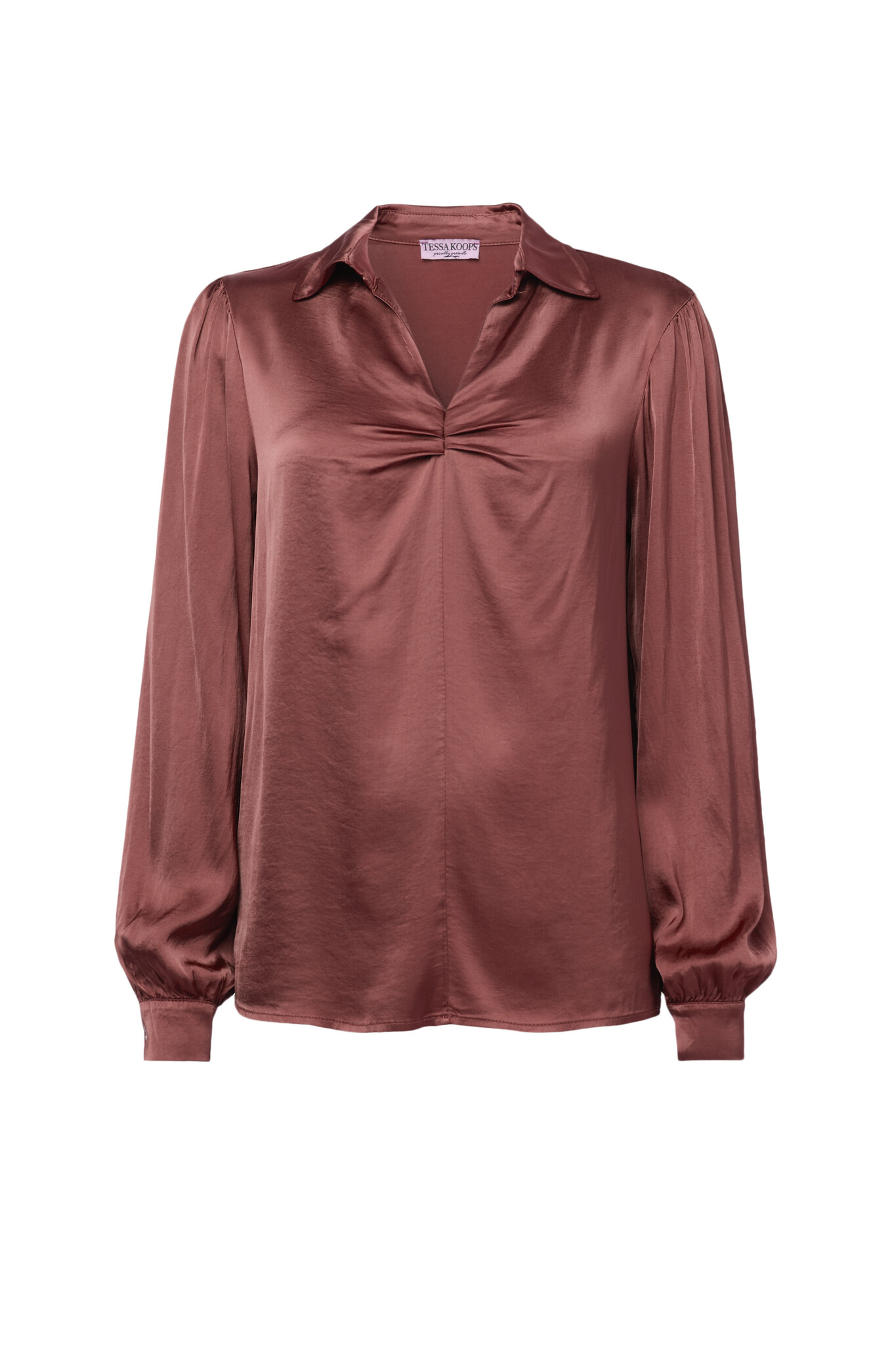 De Maya Satin Sienna Top heeft een V-hals afgezet met een klein sierlijk kraagje. De top heeft lange mouwen met aan de onderzijde een manchet met knoopsluiting als opvallend detail. De Satin feel & look geeft de top een vrouwelijk en modieuze uitstraling