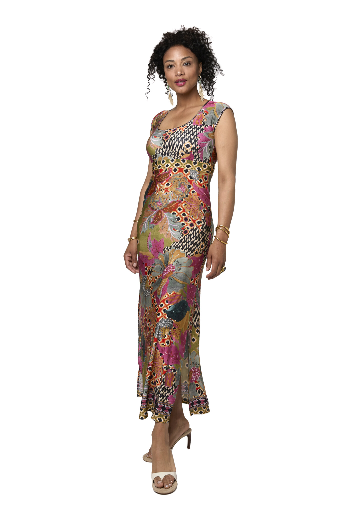 De Rony Primavera Jurk is een mouwloze lange jurk gemaakt van een zachte soepele viscose stof. De jurk heeft een V-hals, een split aan de voorkant, een tailleband voor een flatterend silhouet en een extra detail is de striksluiting in de nek.