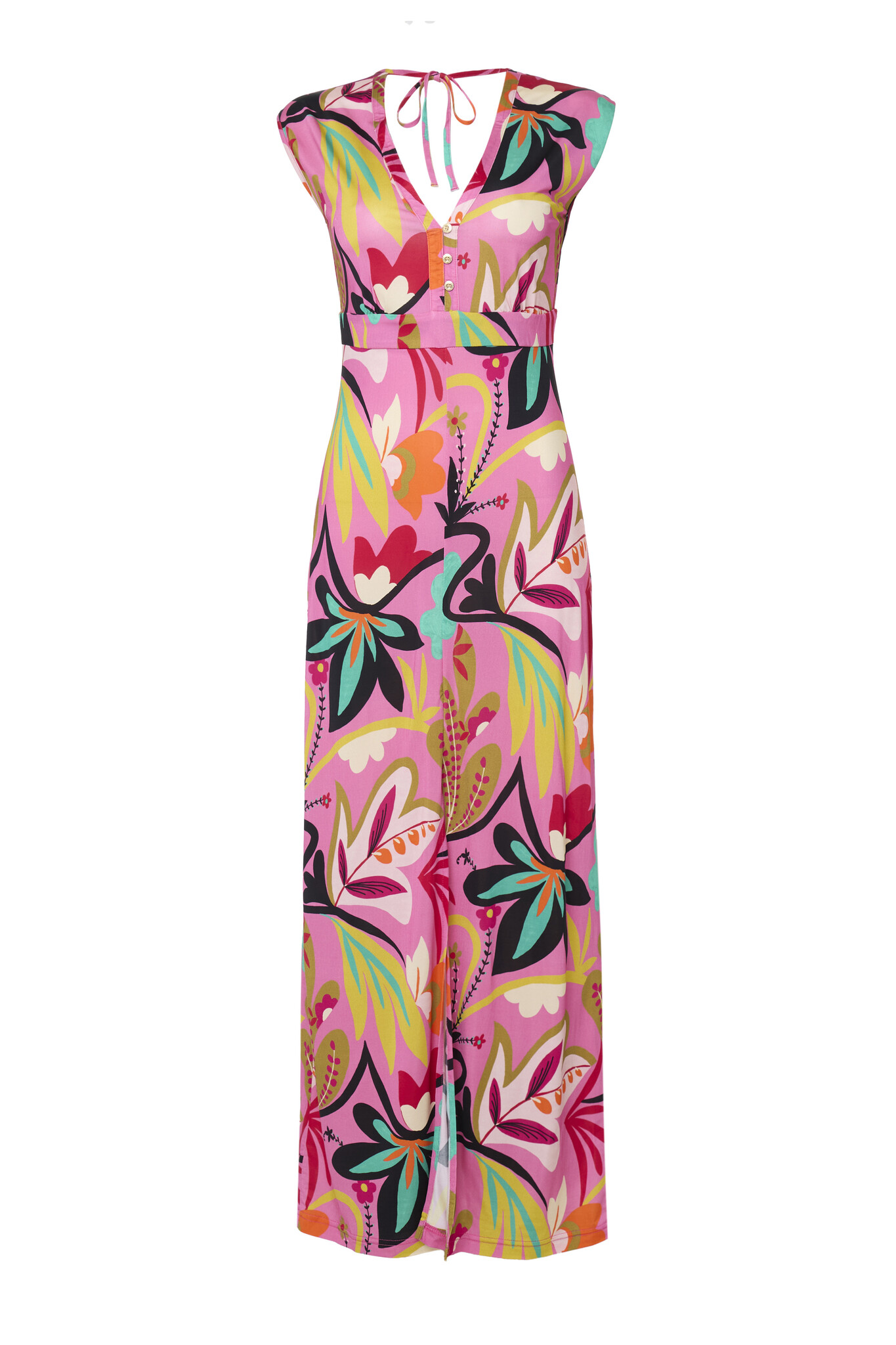 De Rowany Pink Fiesta Jurk is een mouwloze lange jurk gemaakt van een zachte soepele viscose stof. De jurk heeft een V-hals, een split aan de voorkant, een tailleband voor een flatterend silhouet en een extra detail is de striksluiting in de nek.