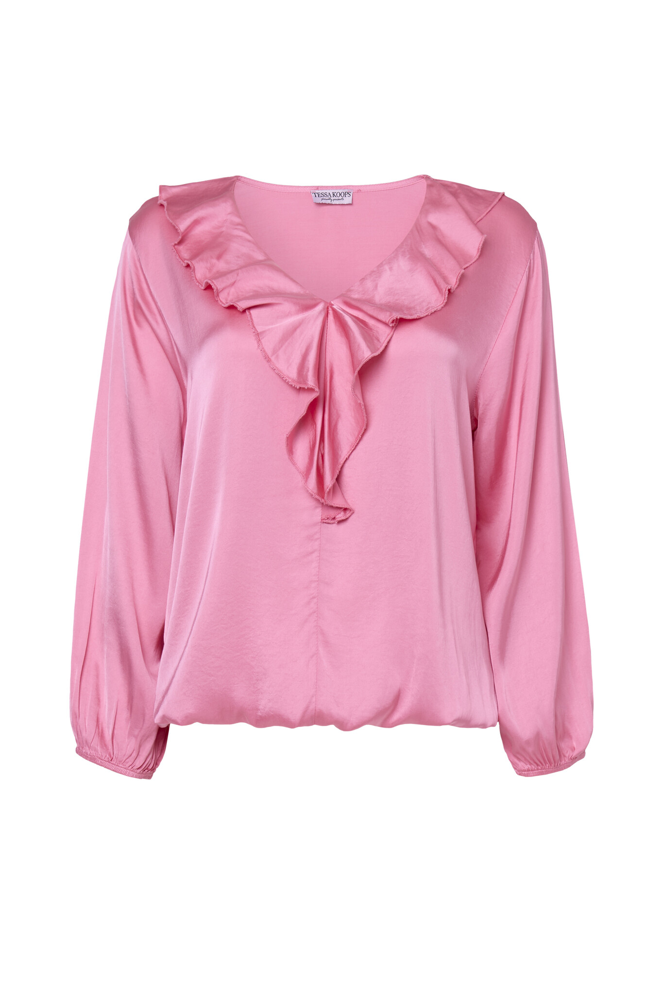 De Salina Satin Oliander Top heeft een V-hals afgezet met sierlijke ruffles. De top heeft lange mouwen met aan de onderzijde een manchet met een elastische band als opvallend detail. De Satin feel & look geeft de top een vrouwelijke en modieuze uitstraling.