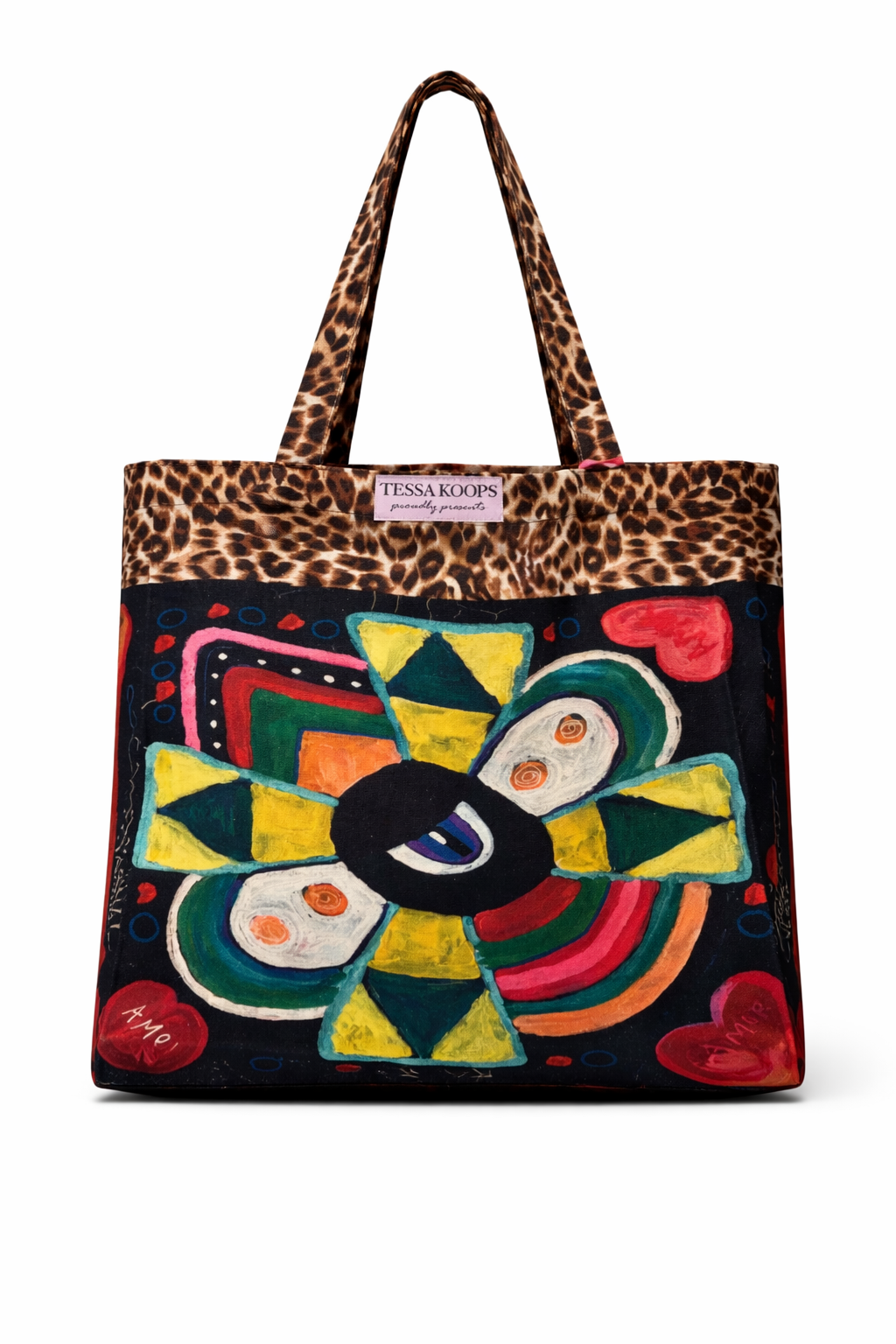 Maak een krachtig statement met de Santa Cruz Tote Bag. Deze opvallende shopper combineert een speelse luipaardprint met een expressief, handgeschilderd artwork aan de voorzijde en andere opvallende print op de achterzijde. Lees meer