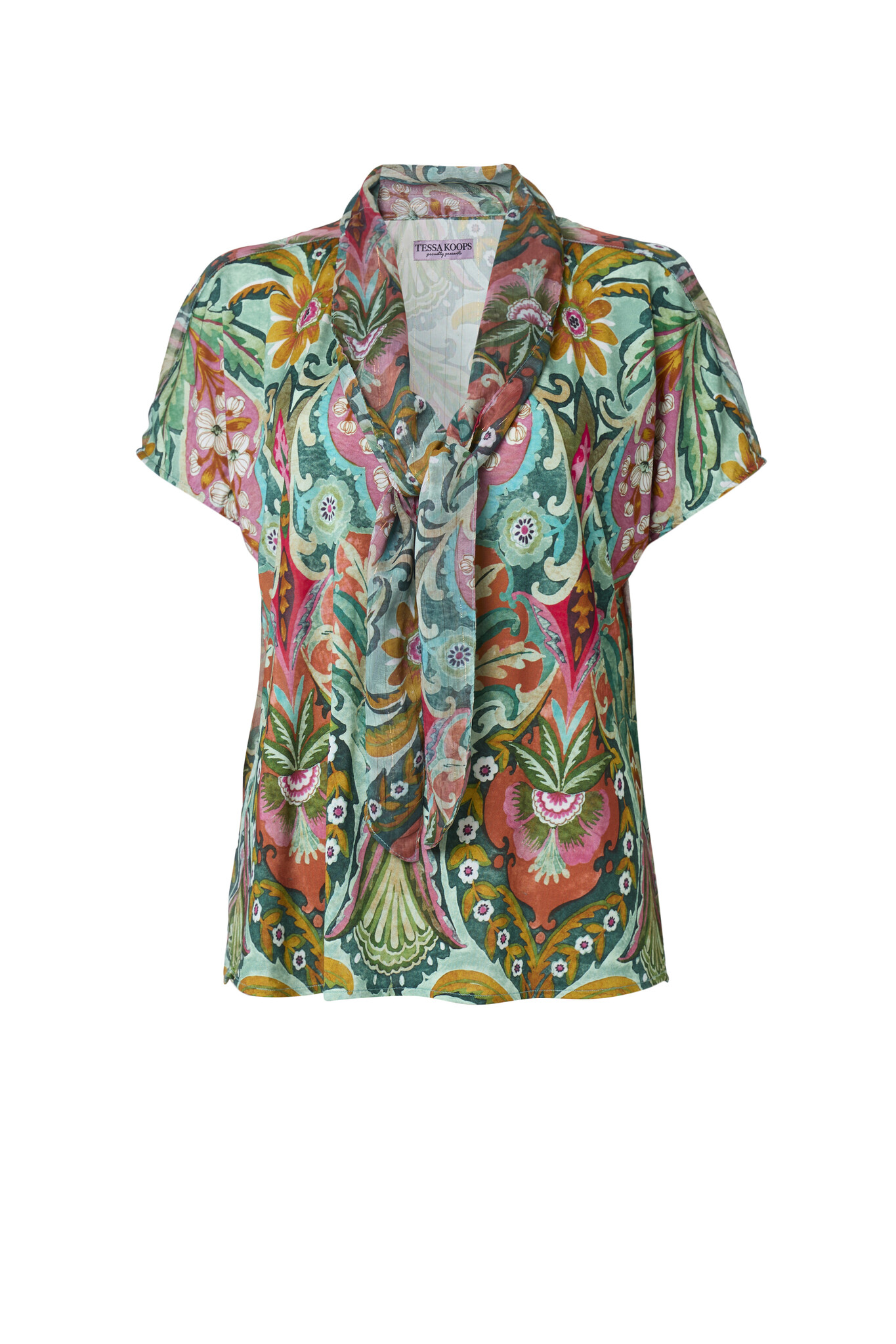 De Tanny Guapa Top heeft korte mouwen en als sierlijk detail een sjaal op de V-hals. Aan de voorkant is een prachtige zachte stof en aan de achterzijde en voor de sjaal een licht transparante stof met een goudachtige draad geweven door de stof. Lees meer