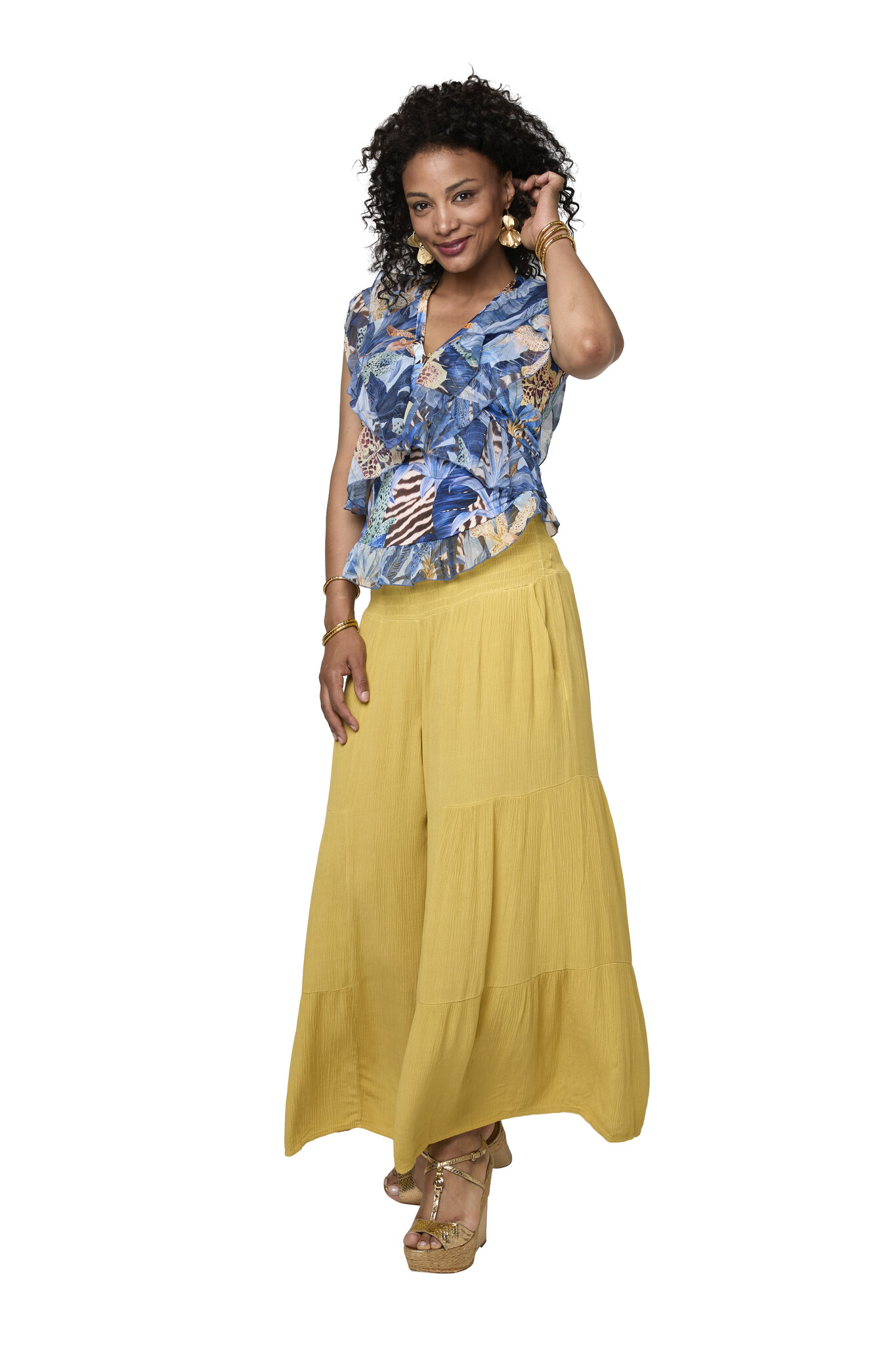 De Ulla Blue Iris Top heeft een V hals met een mooi chiffon detail. De print op de rug is een detail uit de patchwork work aan de voorkant. De top is met vele items en kleuren te combineren. Lees meer