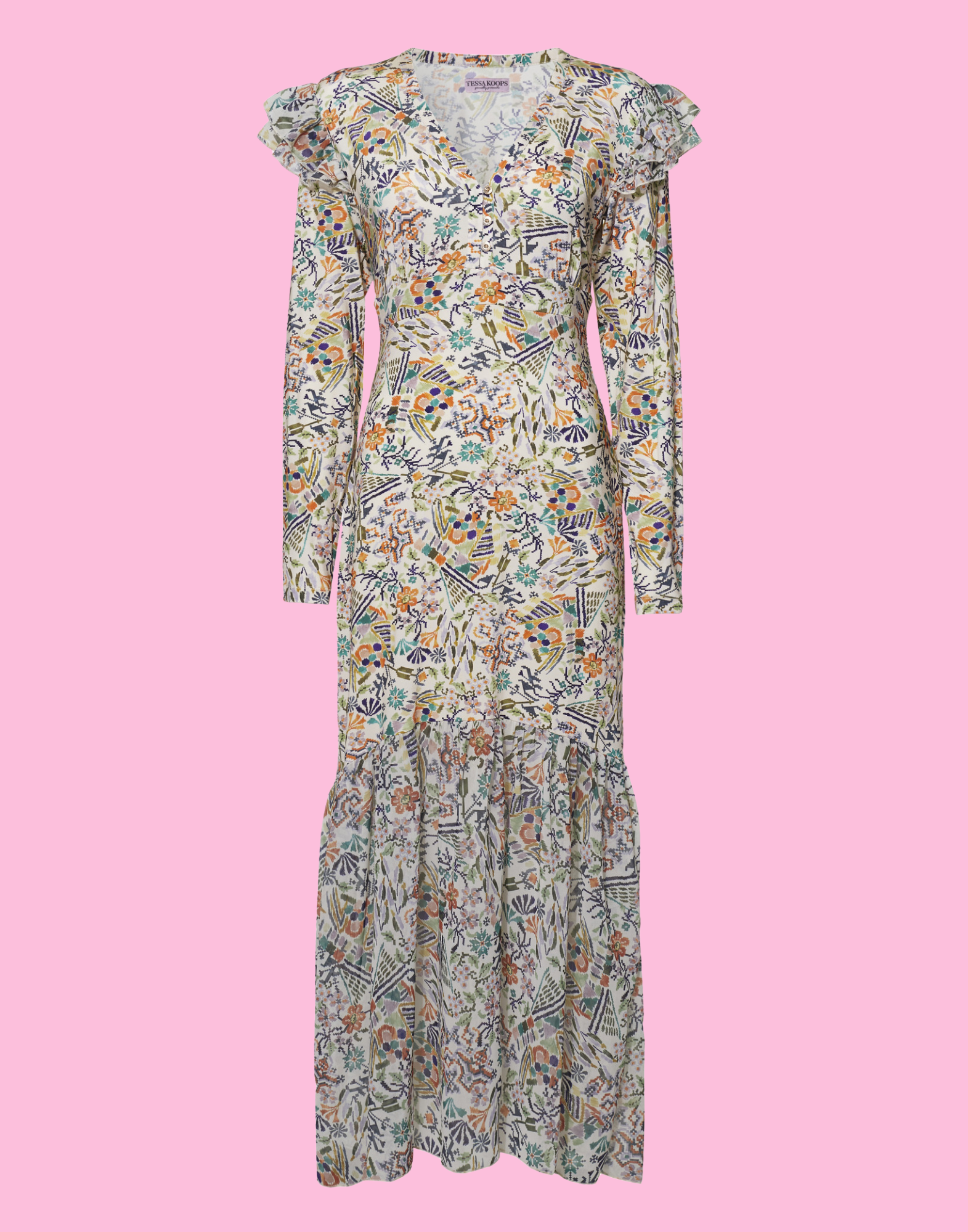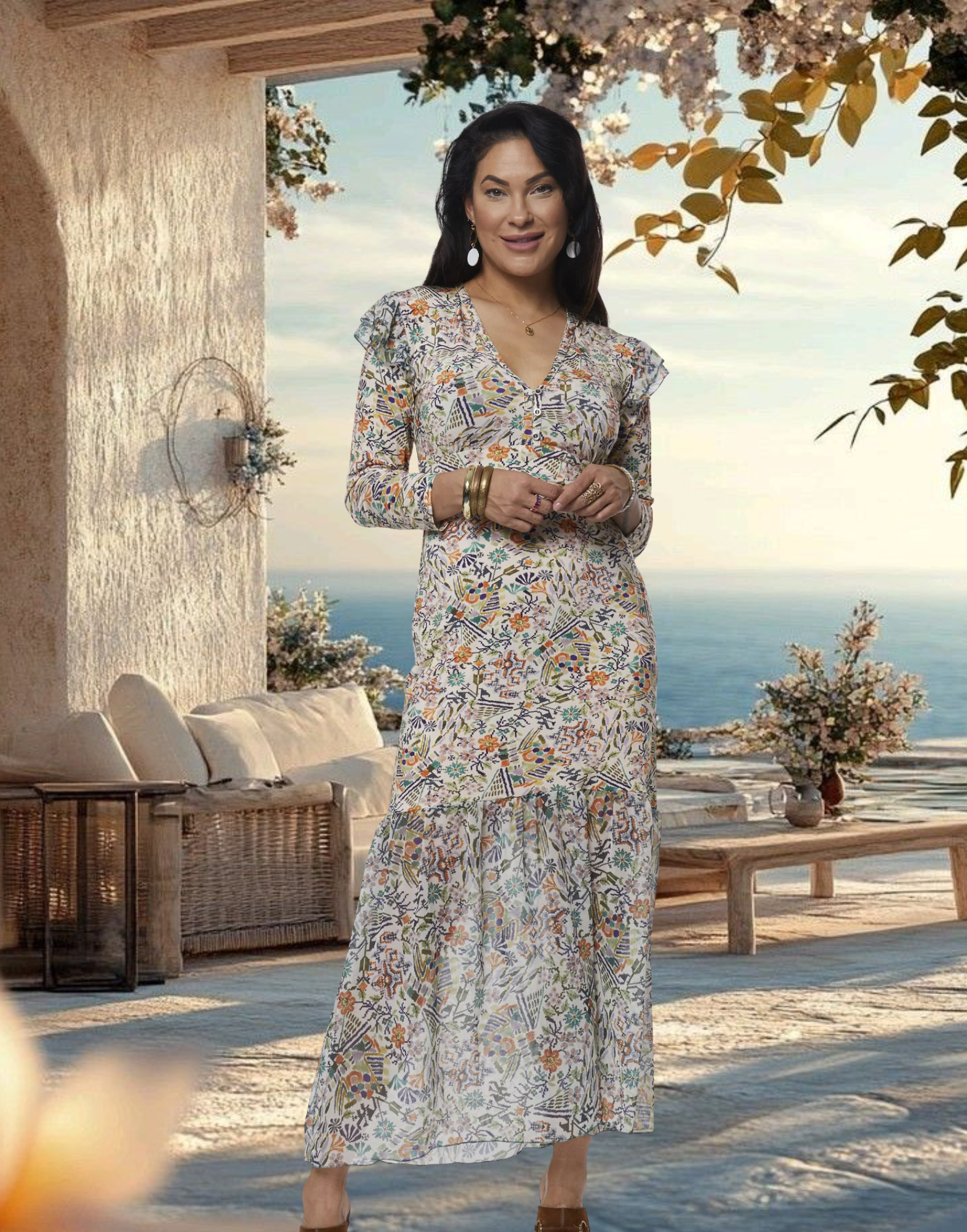 De Valerie Amanti jurk heeft een vrolijke zomers kleurrijke print gemaakt van een heerlijke zachte stof. Door de hoge taille krijgt het figuur een slankere uitstraling. De ruches op de schouders geeft een vrouwelijk en speels effect.