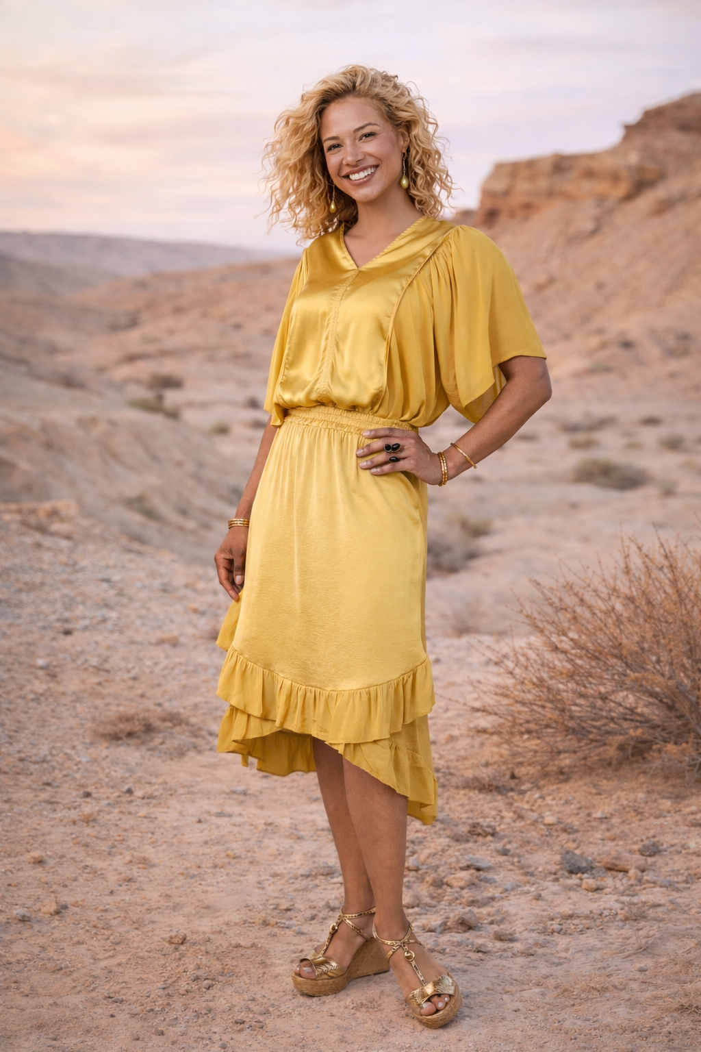 De Zayna Yellow Satin Top is een item dat luxe en elegantie uitstraalt, de top is gemaakt van soepel vallende zachte satijnen stof waardoor deze top heerlijk licht aanvoelt. De V-hals en de elegante vlinder mouwen zorgen voor een flatterende pasvorm.